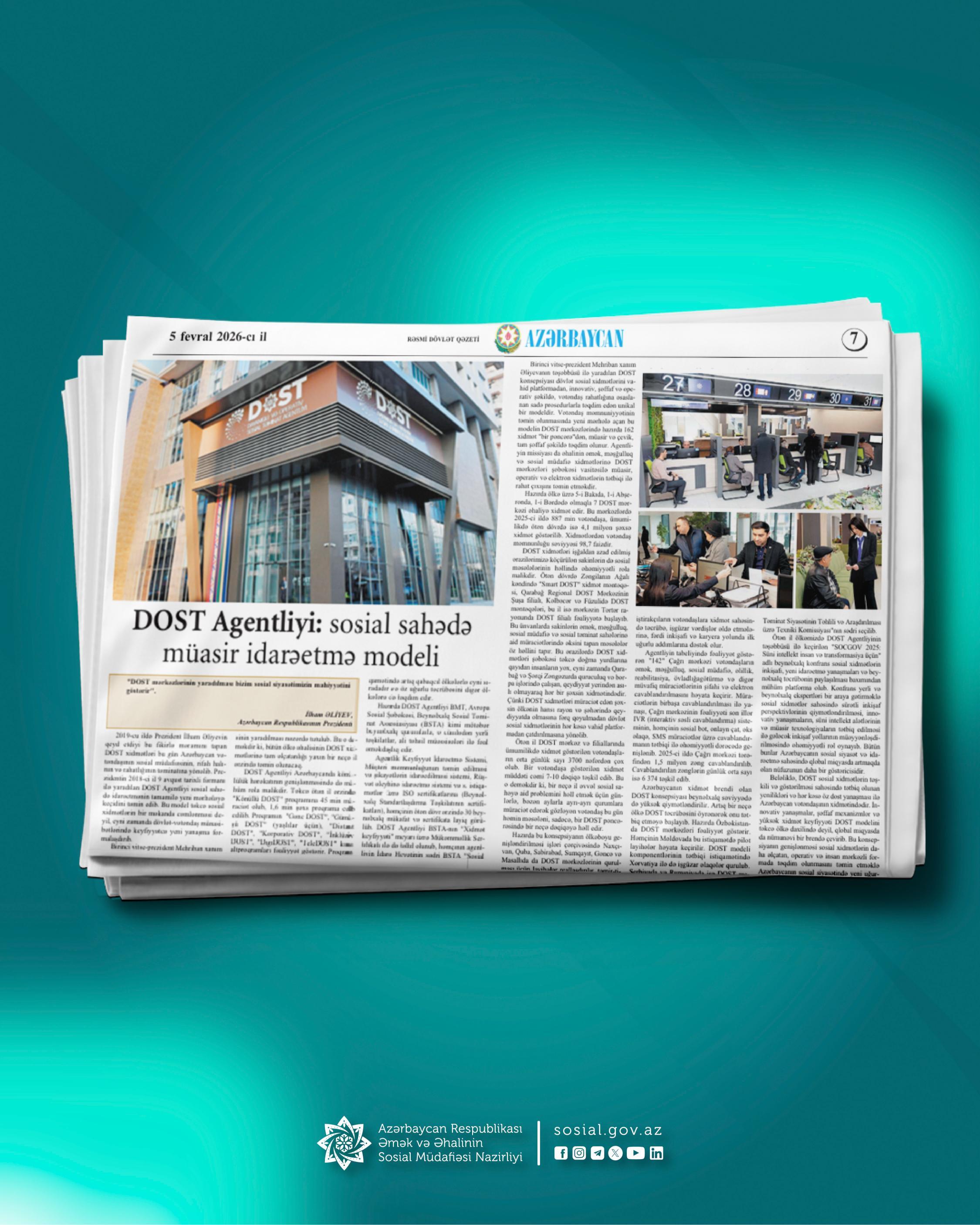 "Azərbaycan" qəzetində sosial sahədə müasir idarəetmə modeli kimi milli brend hesab edilən DOST Agentliyinin fəaliyyəti haqqında məqalə dərc edilib
