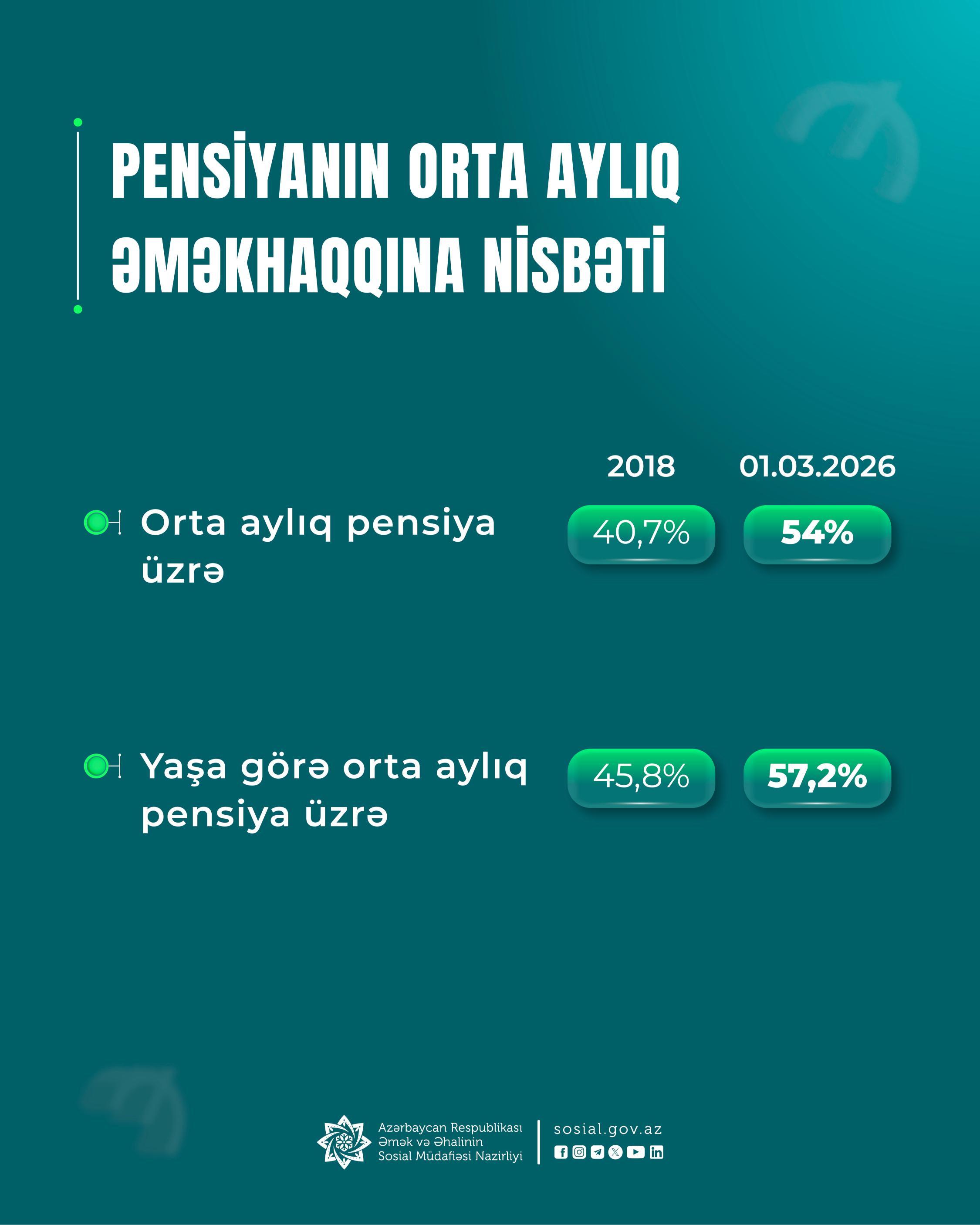 Yaşa görə orta aylıq pensiyanın orta aylıq əməkhaqqına nisbəti 57,2 faizə çatıb