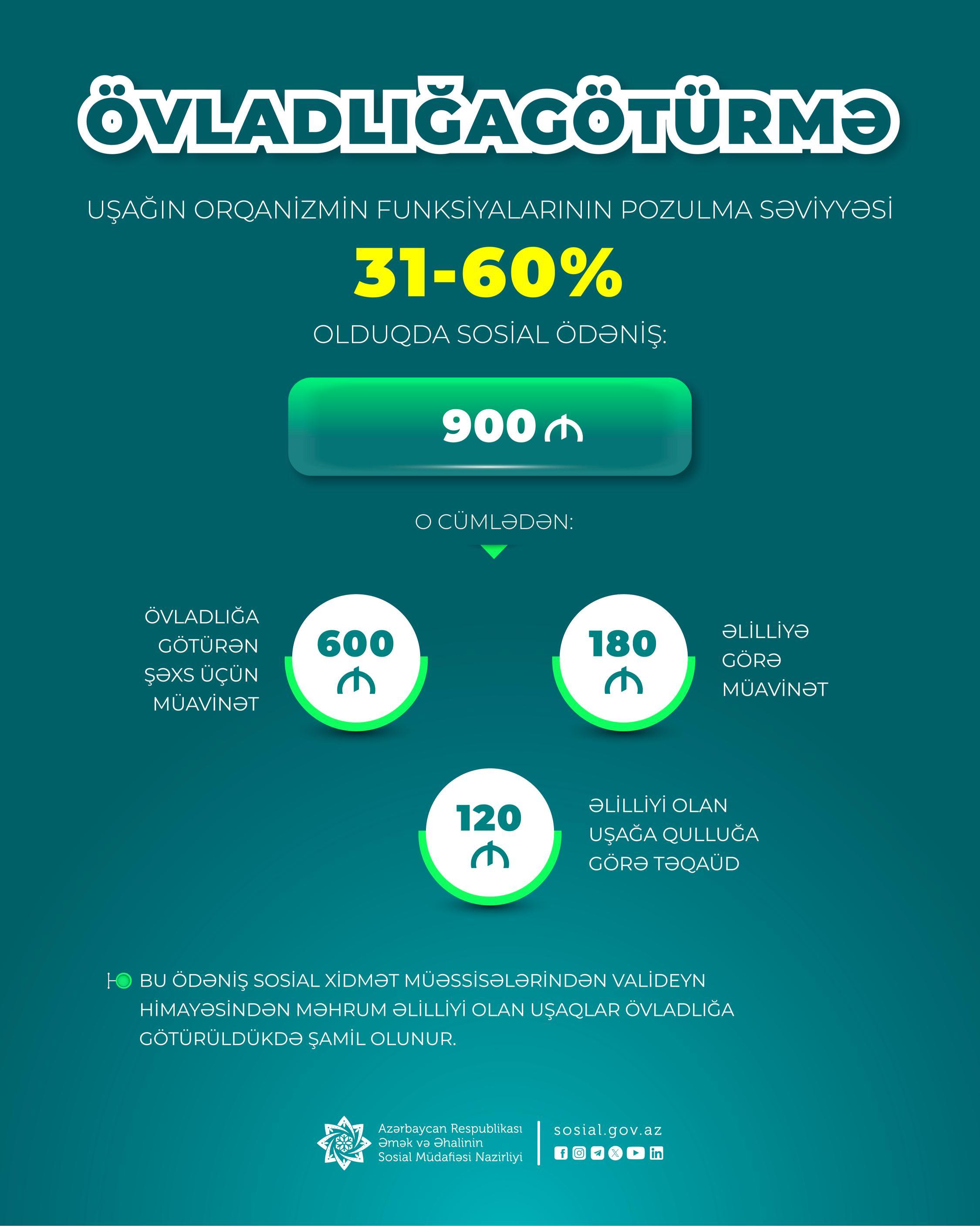 For adopting a child with a disability deprived of parental care from social service institutions, a monthly payment of 600 manats is provided, along with all disability-related payments.