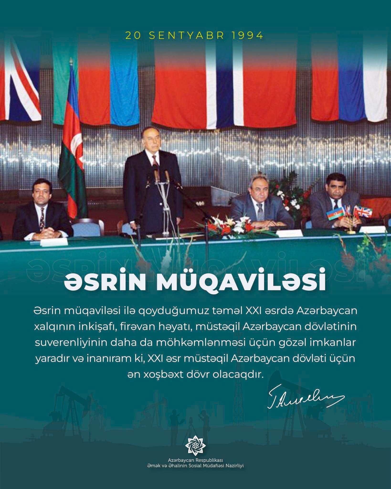 Ümummilli Lider Heydər Əliyevin təşəbbüsü və böyük səyləri nəticəsində Dövlət Neft Şirkəti ilə dünyanın 8 ölkəsinin aparıcı neft şirkətləri arasında neft kontraktlarından ibarət olan, mühüm tarixi, siyasi və beynəlxalq əhəmiyyət kəsb edən “Əsrin müqaviləsi”nin imzalanmasından 31 il ötür.