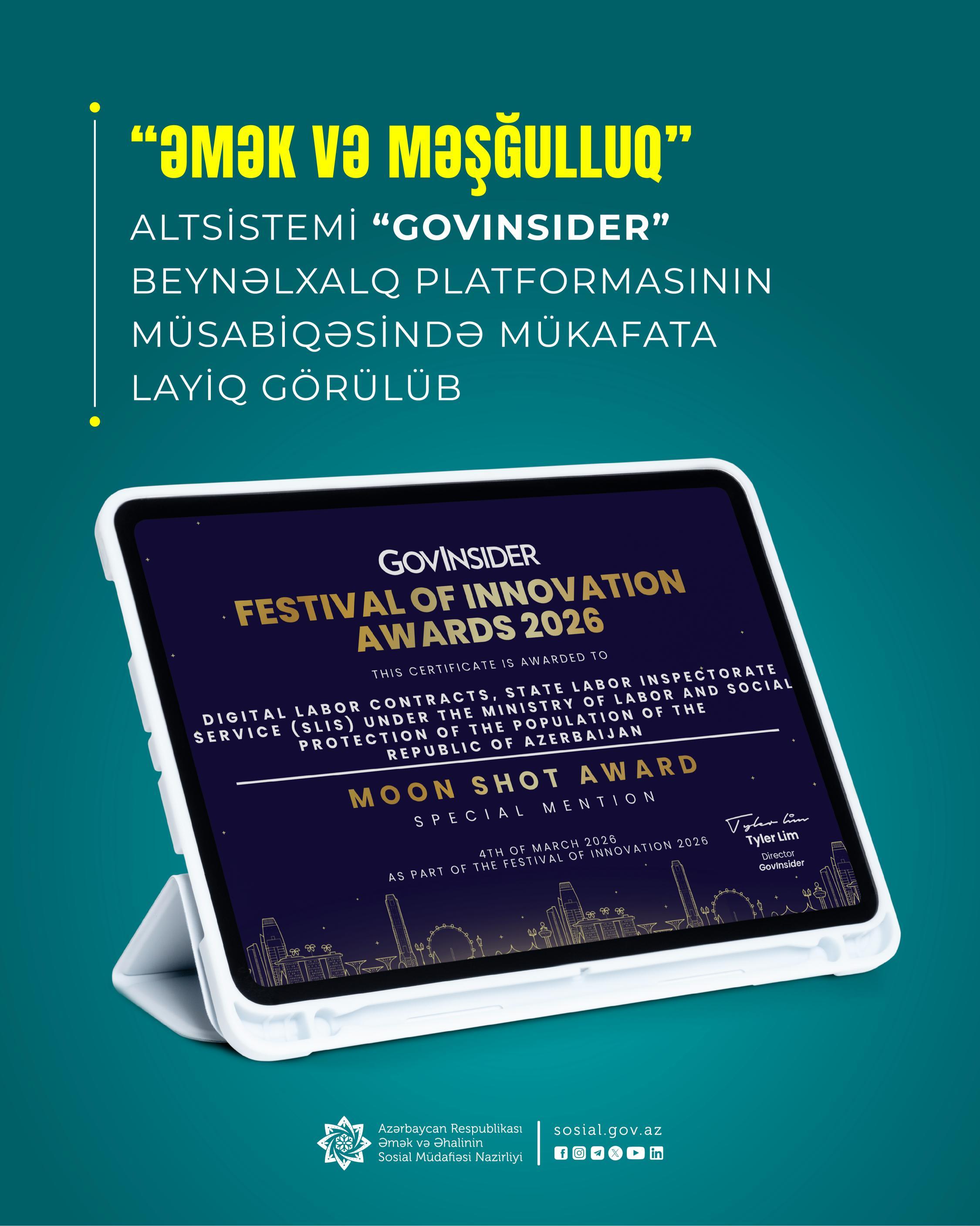 “Əmək və Məşğulluq” altsistemi “GovInsider” beynəlxalq platformasının müsabiqəsində mükafata layiq görülüb