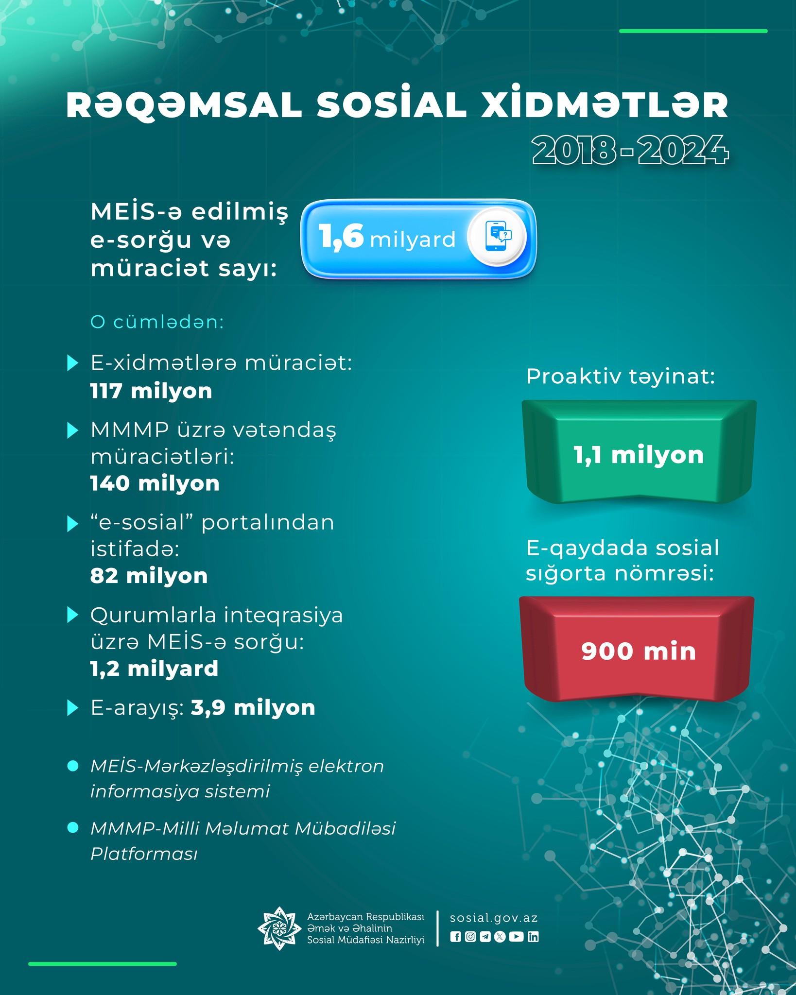 Ötən dövrdə Nazirliyin Mərkəzləşdirilmiş elektron informasiya sisteminə ümumilikdə 1,6 milyard e-sorğu və müraciət qeydə alınıb, e-sistemlər üzərindən 1,1 milyon proaktiv təyinat həyata keçirilib.
