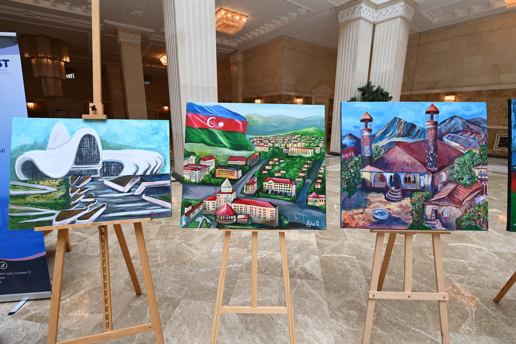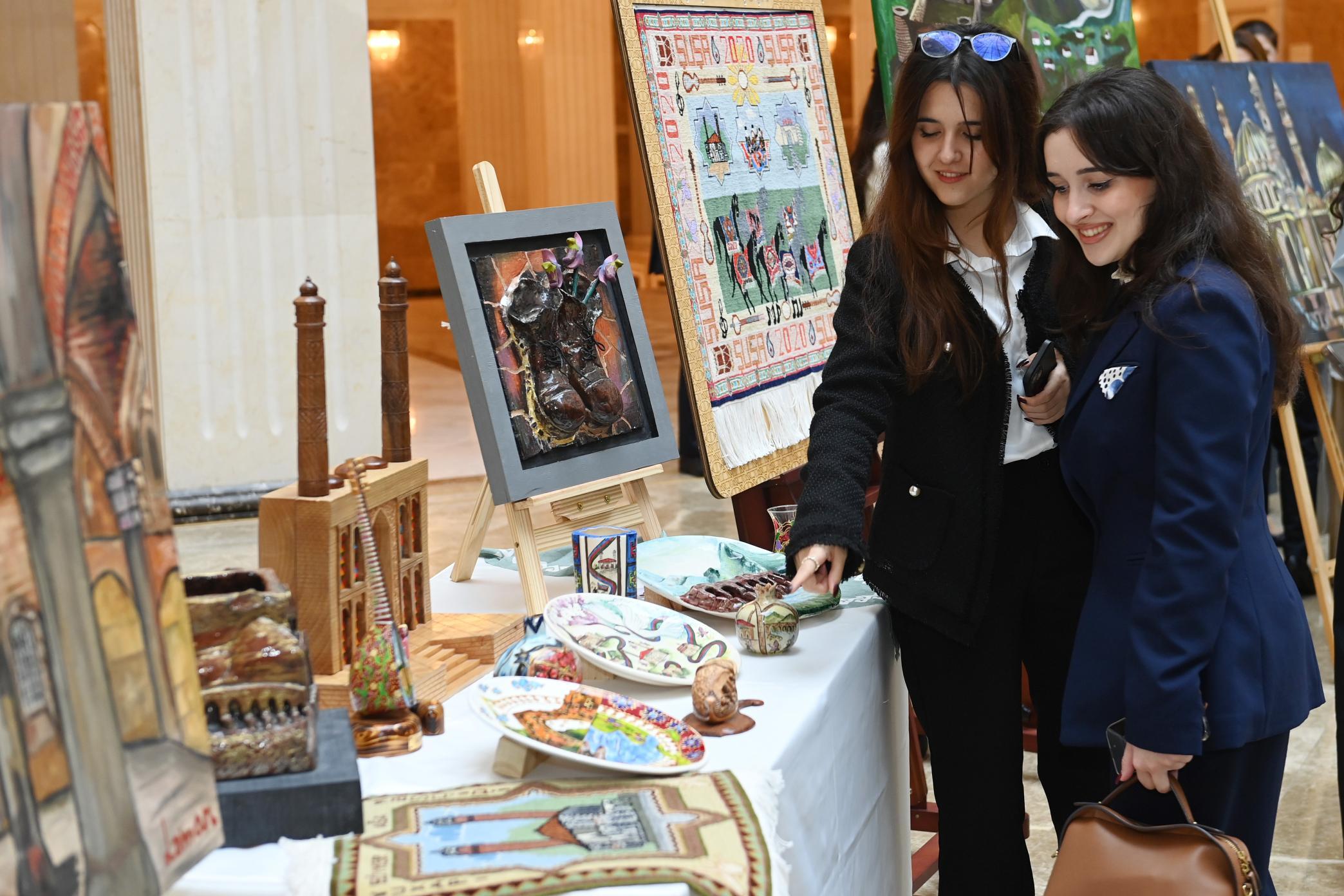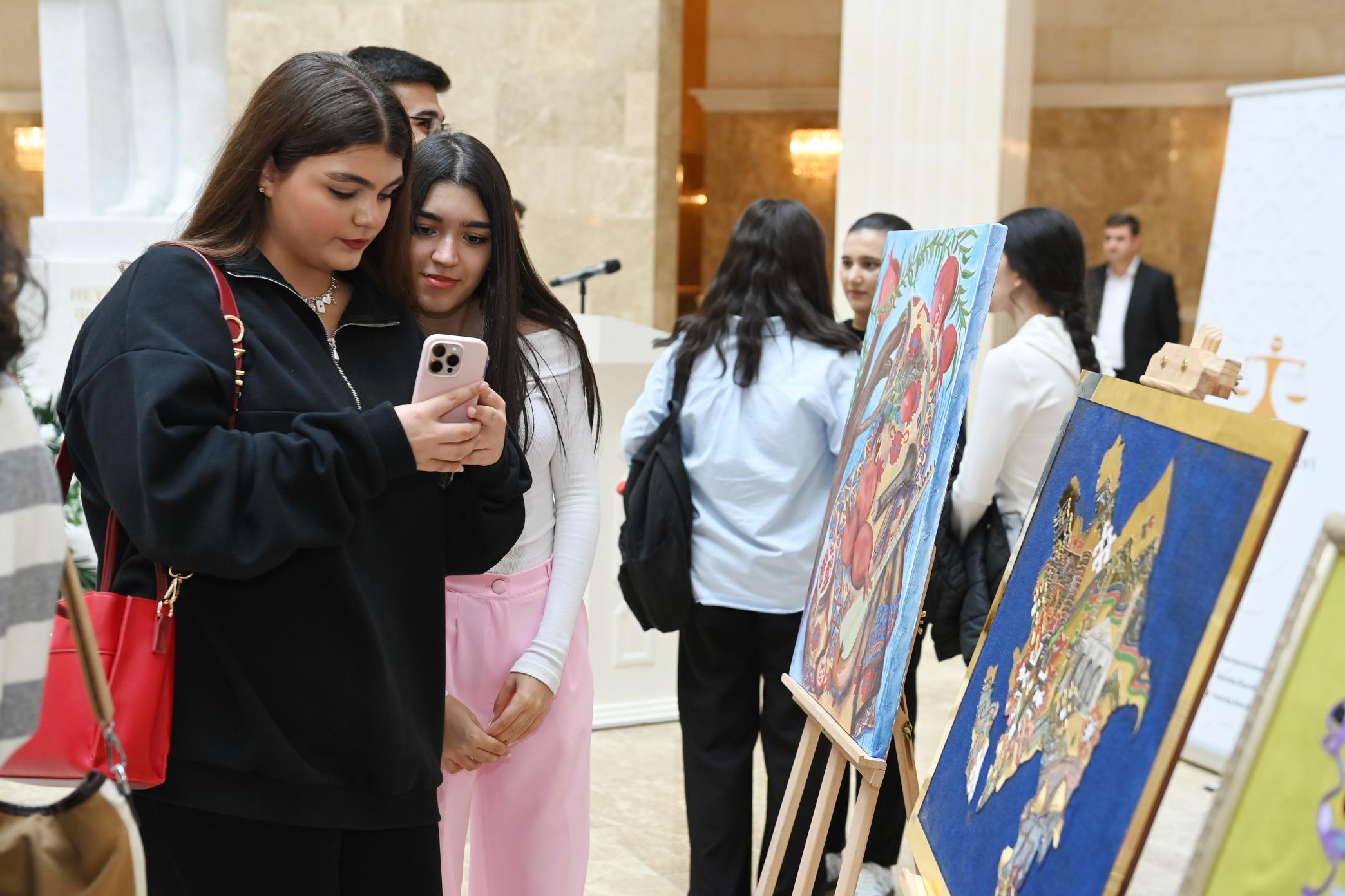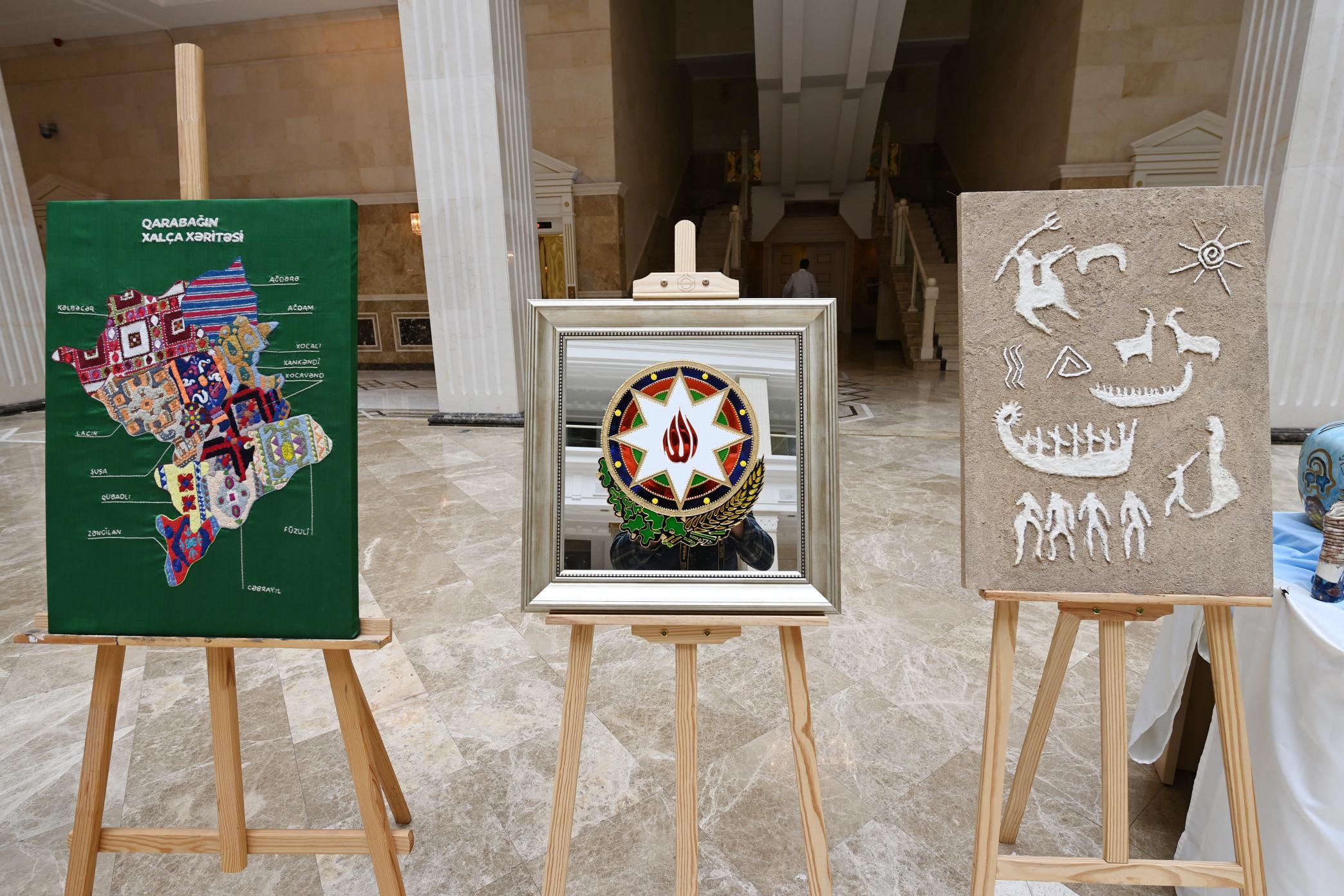 Sərgidə Nazirliyin tabeliyindəki DOST İnklüziv İnkişaf və Yaradıcılıq Mərkəzinin təlimçi və benefisiarlarının 80-dək əl işi nümayiş etdirilib. Müxtəlif janrlarda milli dövlətçilik ruhunda tərtib edilmiş əsərlərin mövzusu qanunçuluq, suverenlik, vətənpərvərlik və insan hüquqları kimi dəyərləri əhatə edib.