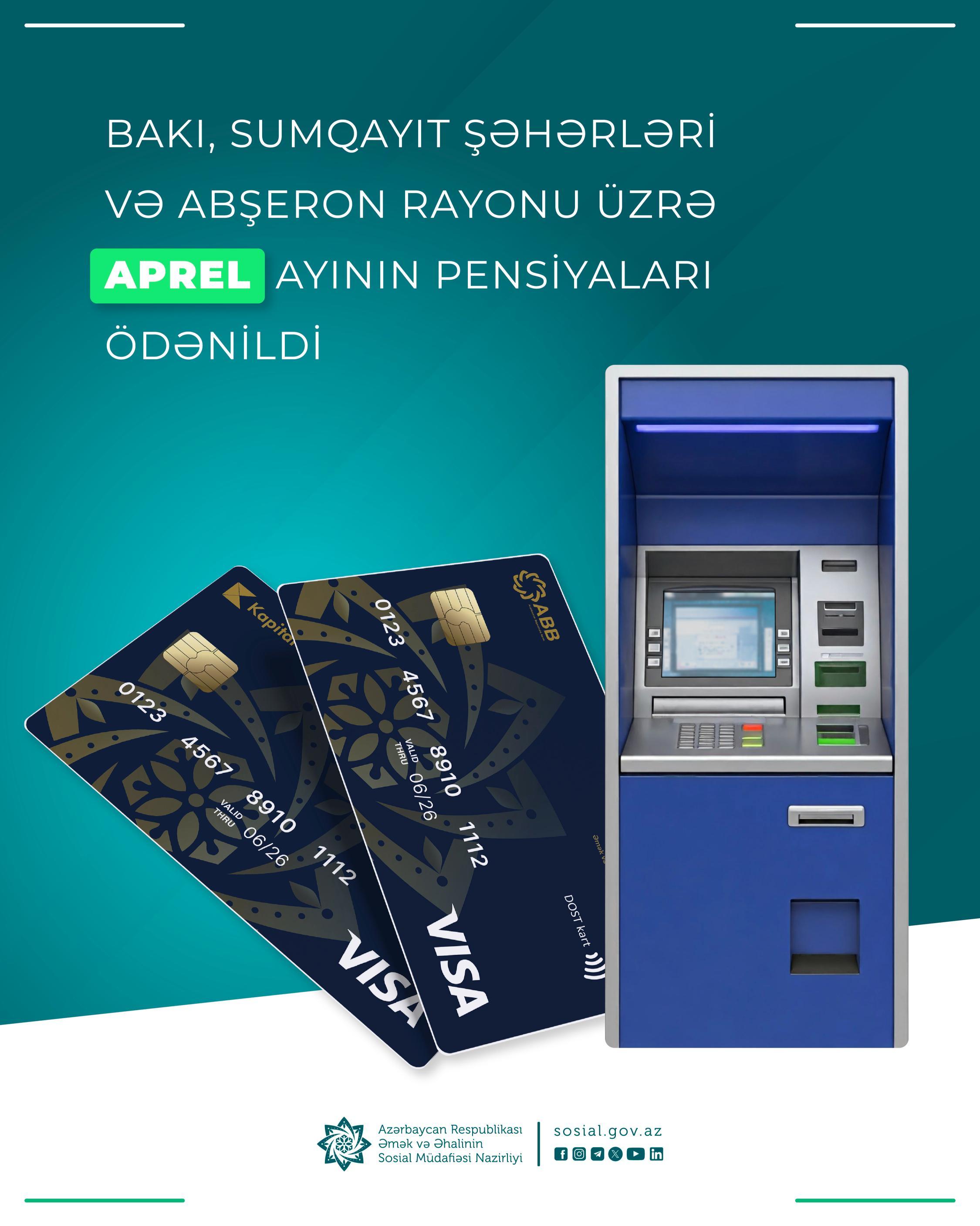 Əmək və Əhalinin Sosial Müdafiəsi Nazirliyinin tabeliyində Dövlət Sosial Müdafiə Fondu tərəfindən Bakı, Sumqayıt şəhərləri və Abşeron rayonu üzrə aprel ayının pensiyaları ödənilib.