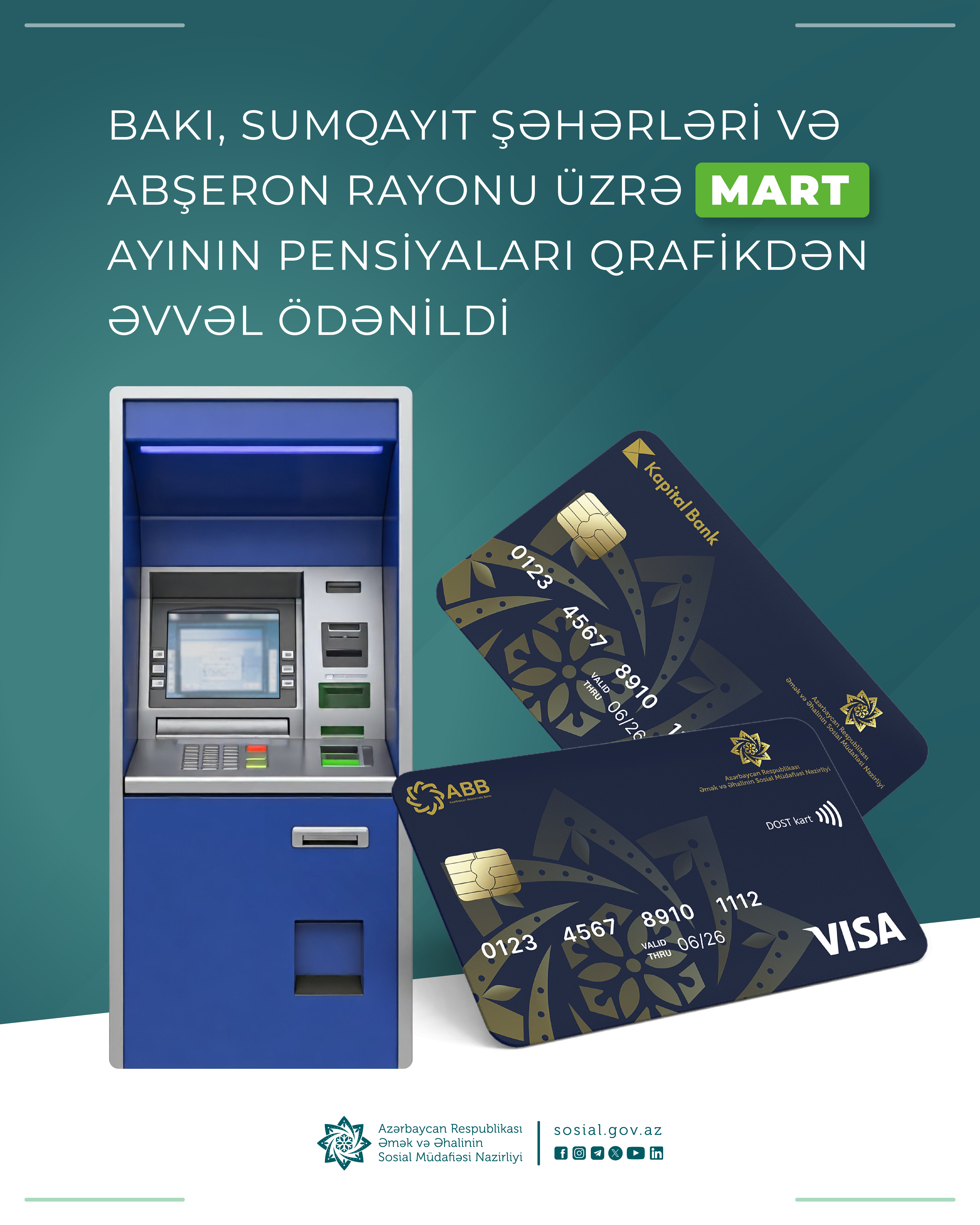 Əmək və Əhalinin Sosial Müdafiəsi Nazirliyinin tabeliyində Dövlət Sosial Müdafiə Fondu tərəfindən Bakı, Sumqayıt şəhərləri və Abşeron rayonu üzrə mart ayının pensiyaları qrafikdən əvvəl ödənilib.