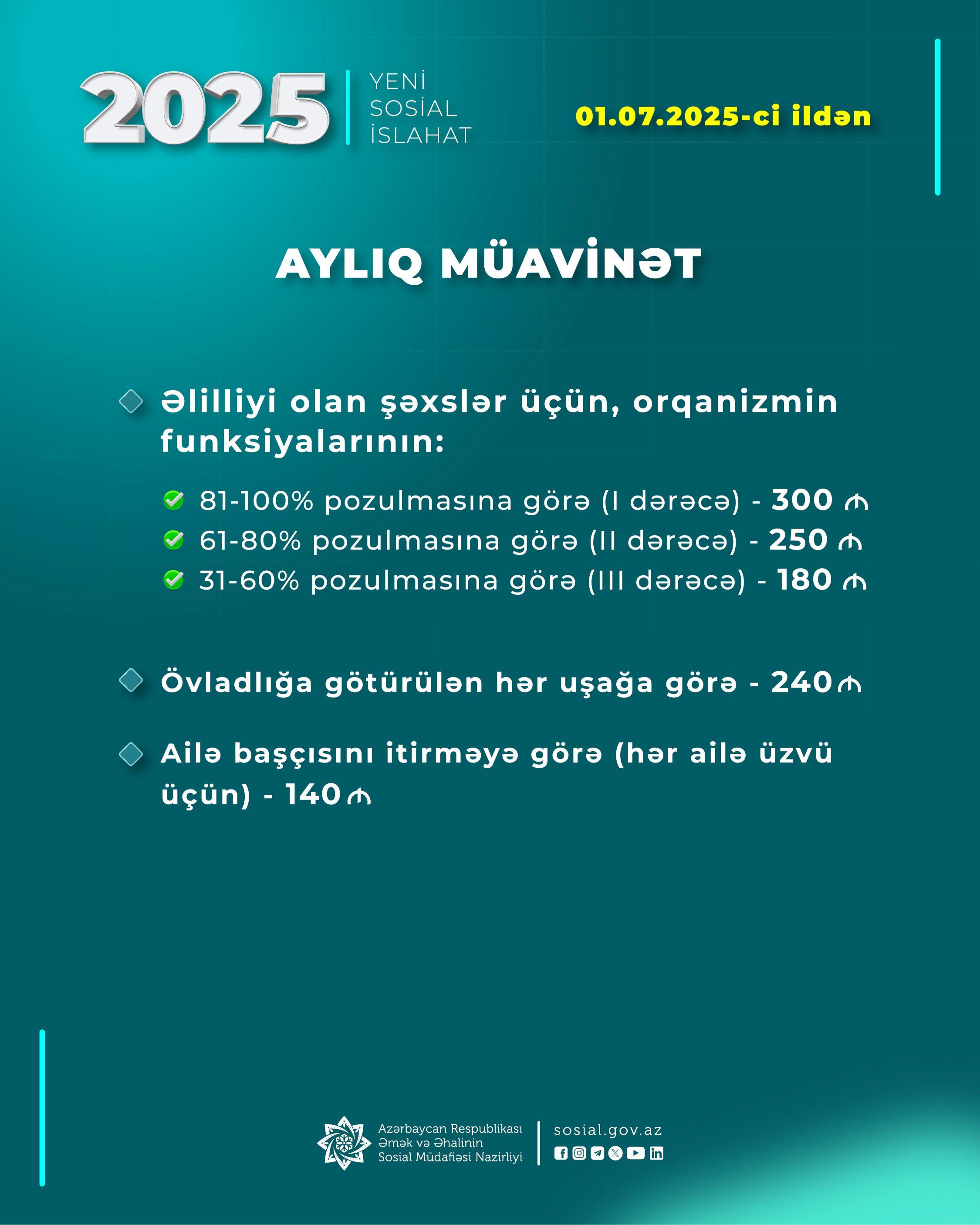 Prezident İlham Əliyevin Fərmanına əsasən, növbəti, 2018-ci ildən ötən dövrdə isə 5-ci sosial islahat paketi çərçivəsində bu gündən - iyulun 1-dən müavinət və təqaüdlər artırılaraq, aşağıdakı məbləğlərdə müəyyən olunub: