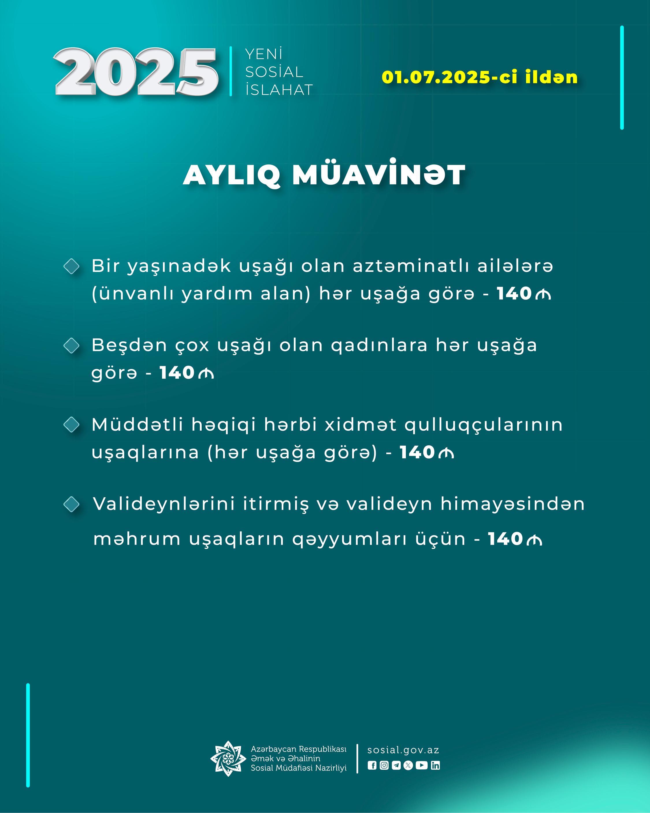 - Bir yaşınadək uşağı olan aztəminatlı ailələrə (ünvanlı yardım alan) hər uşağa görə aylıq müavinət — 140 manat;