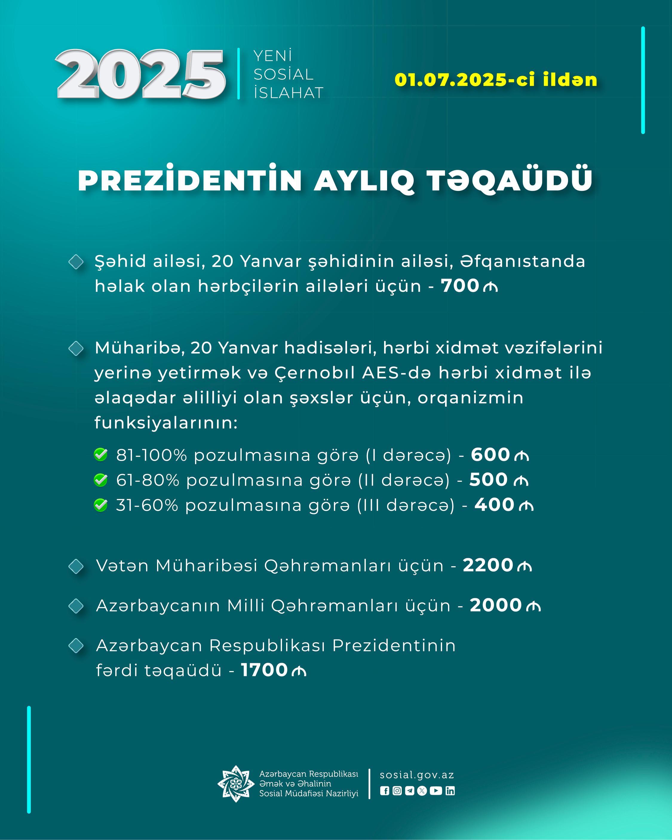- Şəhid ailəsi, 20 Yanvar şəhidinin ailəsi, Əfqanıstanda həlak olan hərbçilərin ailələri üçün Prezidentin aylıq təqaüdü – 700 manat;
