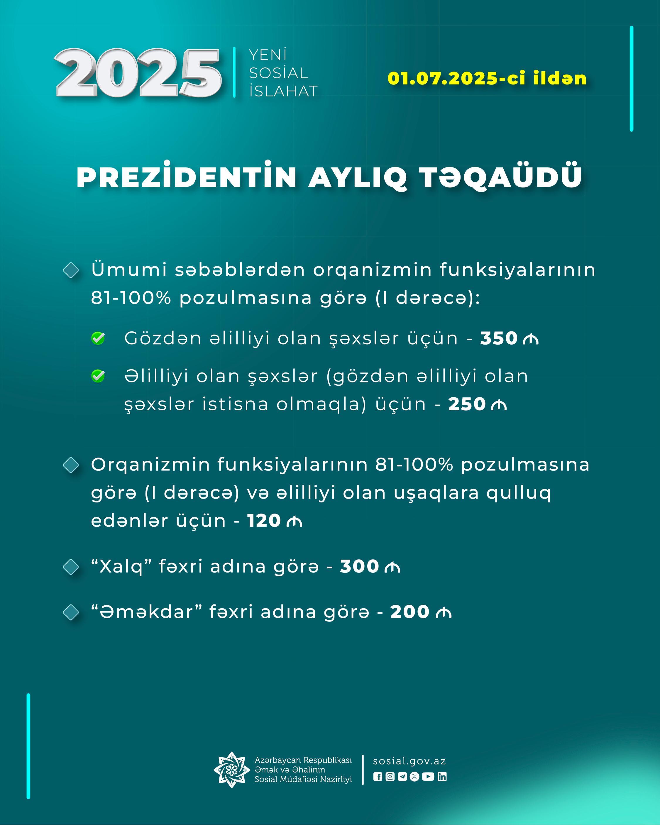 - Orqanizmin funksiyalarının 81-100 faiz pozulmasına görə (I dərəcə) və əlilliyi olan uşaqlara qulluq edənlərə Prezidentin aylıq təqaüdü — 120 manat;