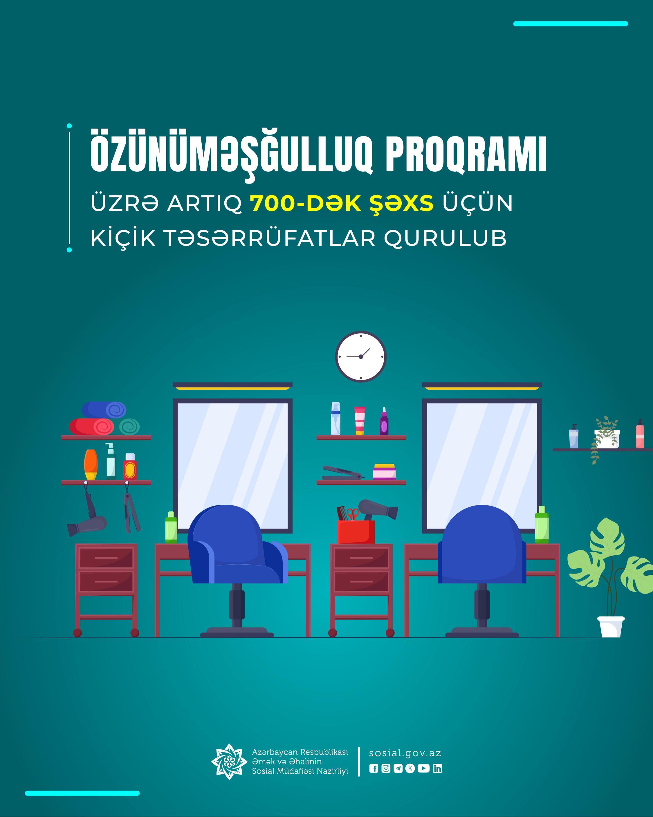 Əmək və Əhalinin Sosial Müdafiəsi Nazirliyinin tabeliyindəki Dövlət Məşğulluq Agentliyi tərəfindən bu il artıq 700-dək şəxsə özünüməşğulluq proqramı çərçivəsində aktivlər təqdim olunub.