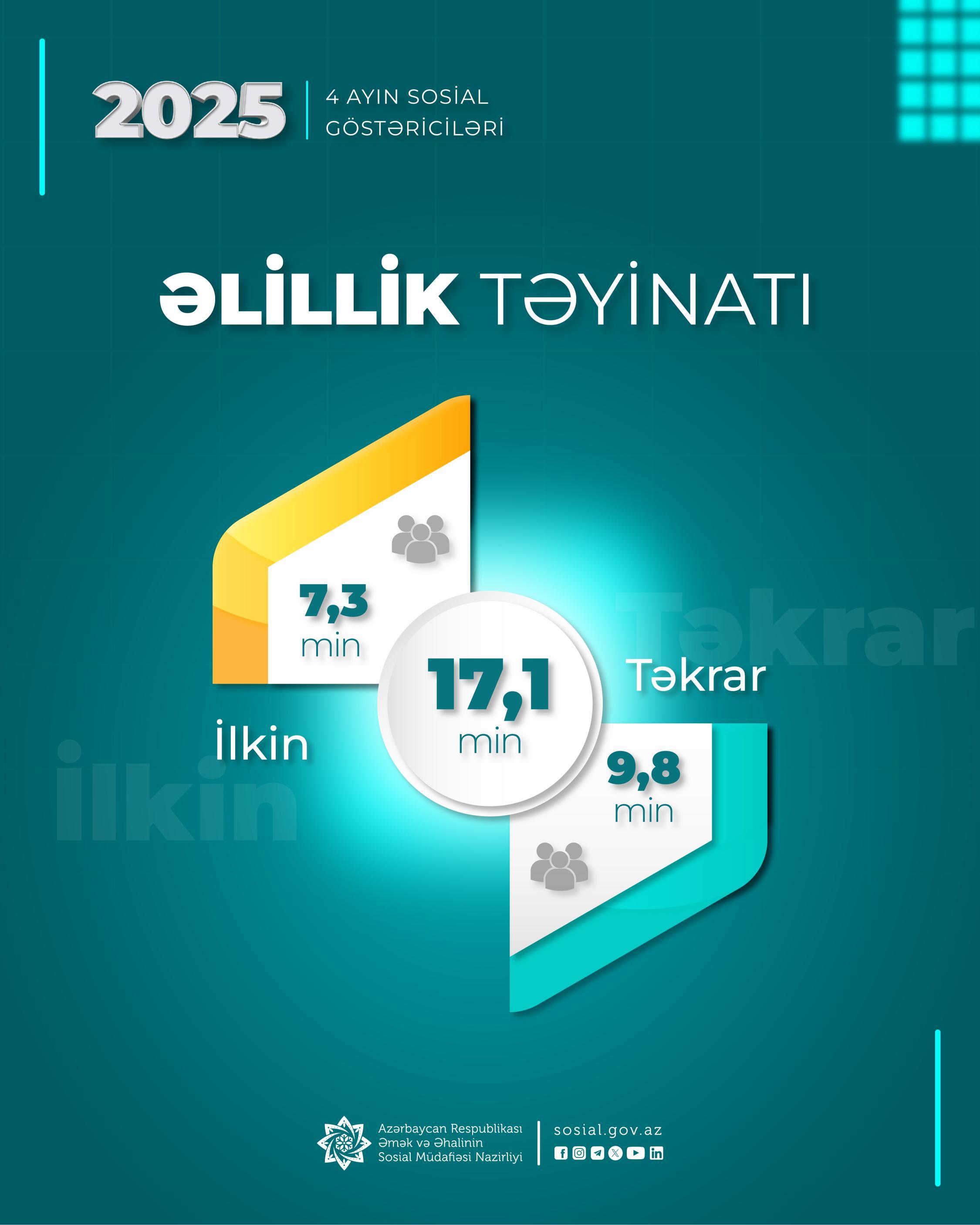 Əmək və Əhalinin Sosial Müdafiəsi Nazirliyinin tabeliyindəki Dövlət Tibbi-Sosial Ekspertiza və Reabilitasiya Agentliyi tərəfindən 2025-ci ilin yanvar-aprel ayları ərzində 17100 şəxsə əlillik təyin edilib.