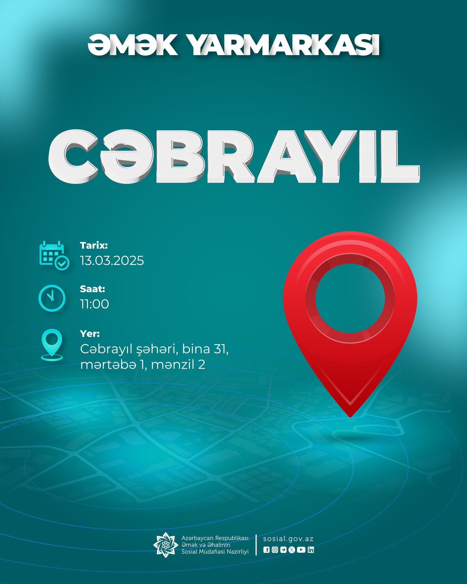 Şərqi Zəngəzur iqtisadi rayonuna daxil olan Cəbrayıl, Qubadlı və Zəngilan rayonlarında Azərbaycan Respublikası Prezidentinin xüsusi nümayəndəliyinin dəstəyi ilə Əmək və Əhalinin Sosial Müdafəsi Nazirliyinin tabeliyində Dövlət Məşğulluq Agentliyi “Azəriqaz” İstehsalat Birliyi ilə birgə Cəbrayıl rayonunda növbəti əmək yarmarkası keçirəcək.