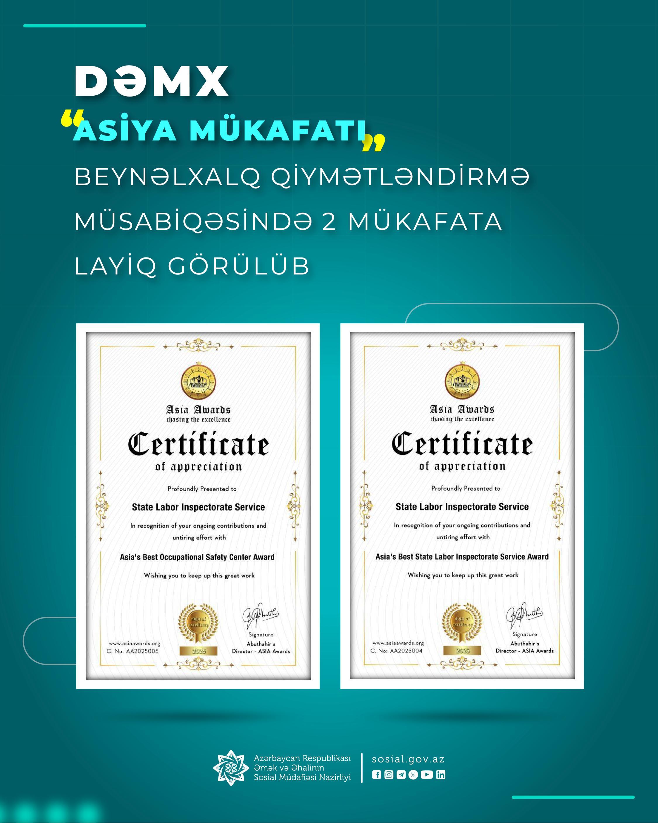 DƏMX müsabiqədə “Asiyanın Ən Yaxşı Dövlət Əmək Müfəttişliyi Xidməti Mükafatı” və “Asiyanın Ən Yaxşı Əməyin Mühafizəsi Mərkəzi Mükafatı” nominasiyayaları üzrə fərqlənib və adı qaliblər sırasına daxil edilib. (https://www.asiaawards.org/country/azerbaijan-awards )