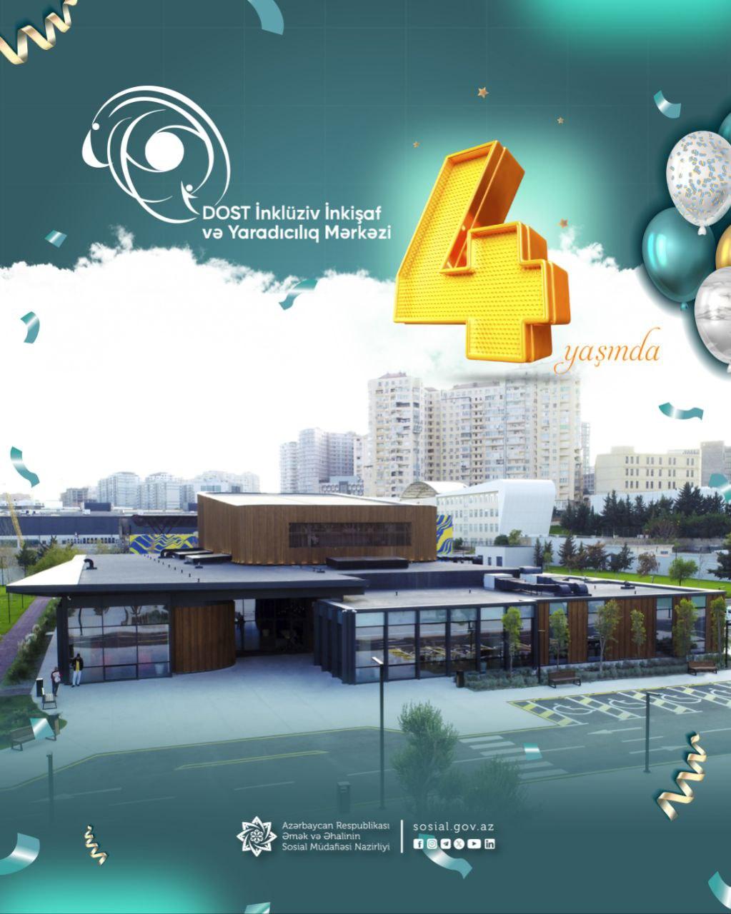 Bu gün Əmək və Əhalinin Sosial Müdafiəsi Nazirliyinin tabeliyindəki DOST İnklüziv İnkişaf və Yaradıcılıq Mərkəzinin açılışından 4 il ötür.