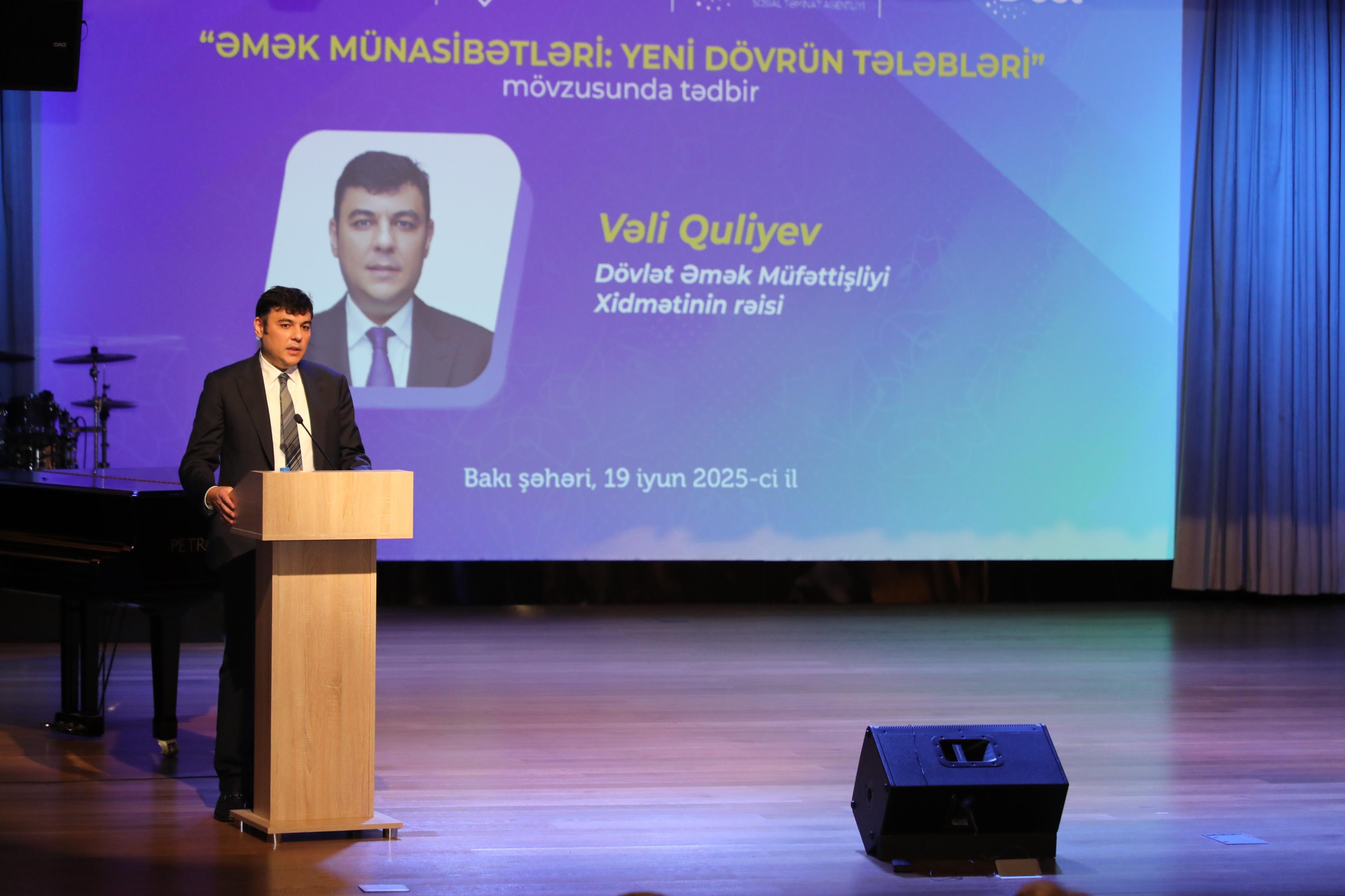 Tədbirdə əmək və əhalinin sosial müdafiəsi nazirinin müavini Rəşad Mustafayev aparılan sosial islahatların əmək münasibətləri sahəsini də əhatə etdiyini vurğulayıb. O, əmək qanunvericiliyinin mütərəqqi beynəlxalq təcrübə əsasında təkmilləşdirilməsi, əmək və məşğulluq sahələri üzrə xidmətlərin rəqəmsallaşdırılması istiqamətində son illər atılan addımları qeyd edib.