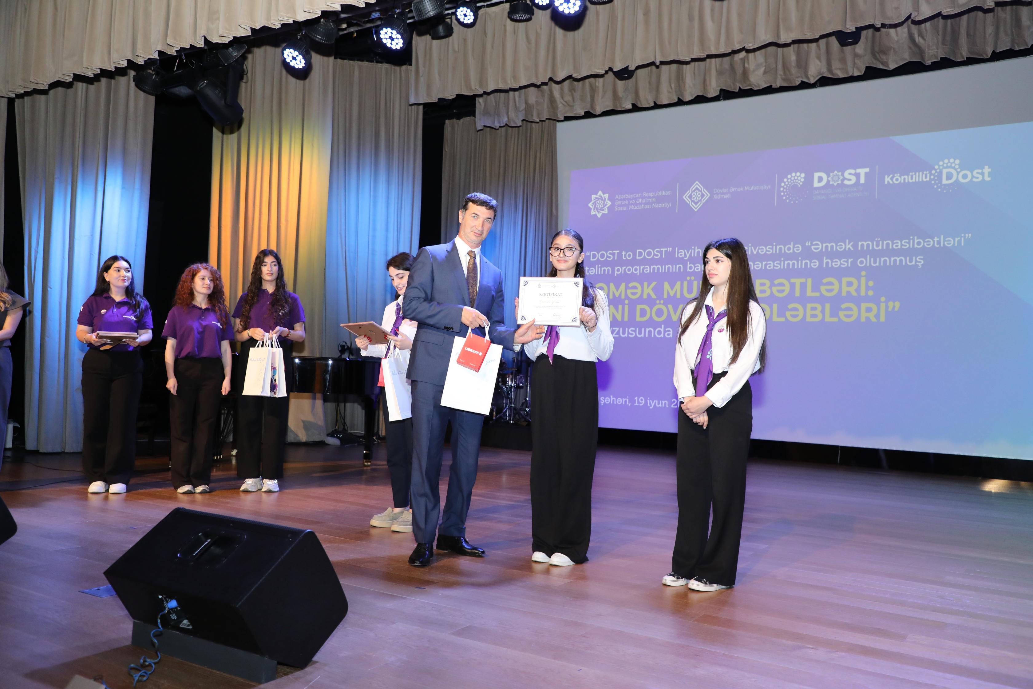 Əmək və Əhalinin Sosial Müdafiəsi Nazirliyi yanında Dövlət Əmək Müfəttişliyi Xidməti və Nazirliyin tabeliyindəki DOST Agentliyinin birgə həyata keçirdiyi “DOST to DOST” layihəsi çərçivəsində “Əmək münasibətləri” adlı təlim proqramının bağlanış mərasiminə həsr olunmuş “Əmək münasibətləri: yeni dövrün tələbləri” adlı tədbir təşkil olunub.