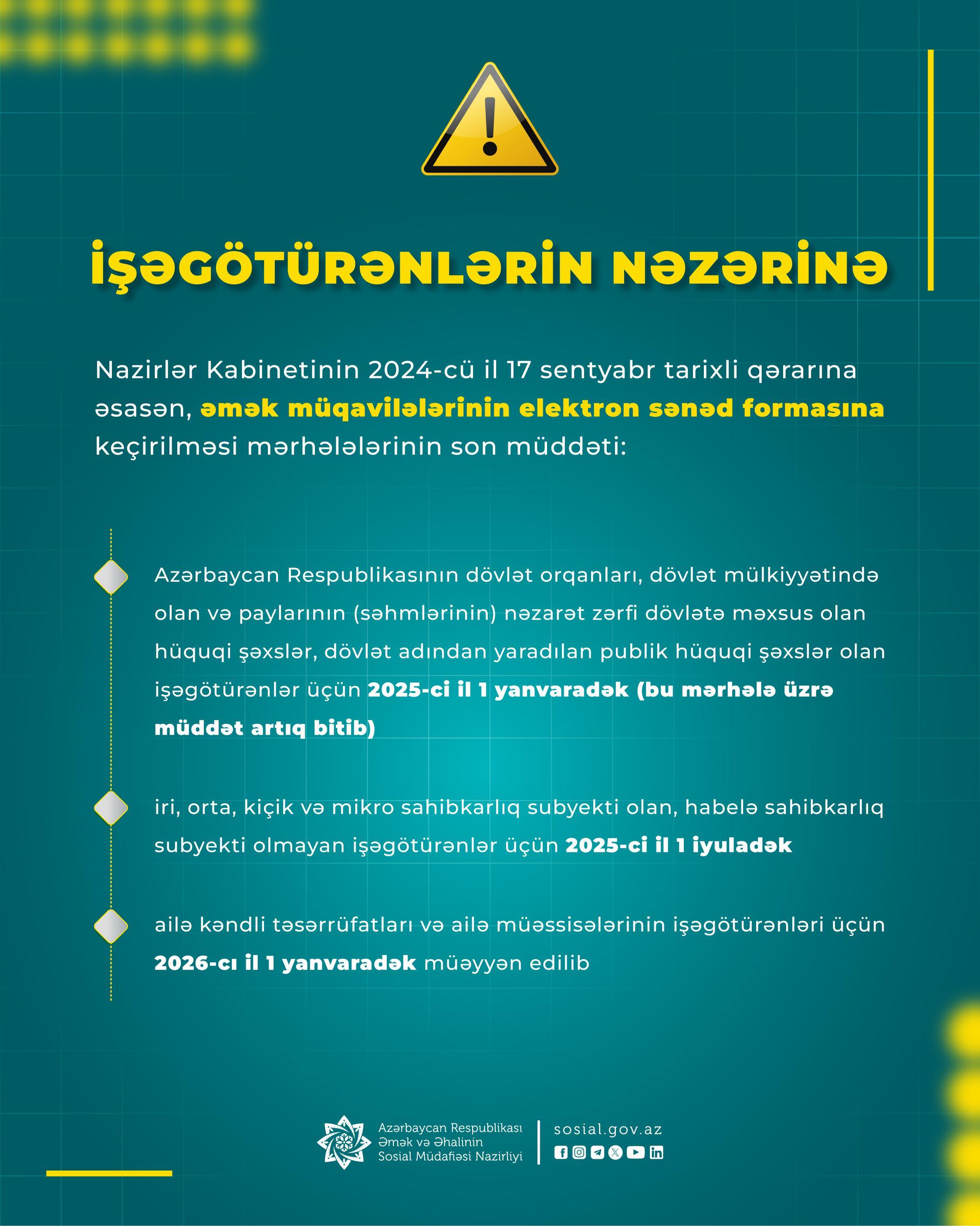 Bir daha işəgötürənlərin diqqətinə çatdırılır ki, Nazirlər Kabinetinin 2024-cü il 17 sentyabr tarixli qərarına əsasən, əmək müqavilələrinin elektron sənəd formasına keçirilməsi mərhələlərinin son müddəti: