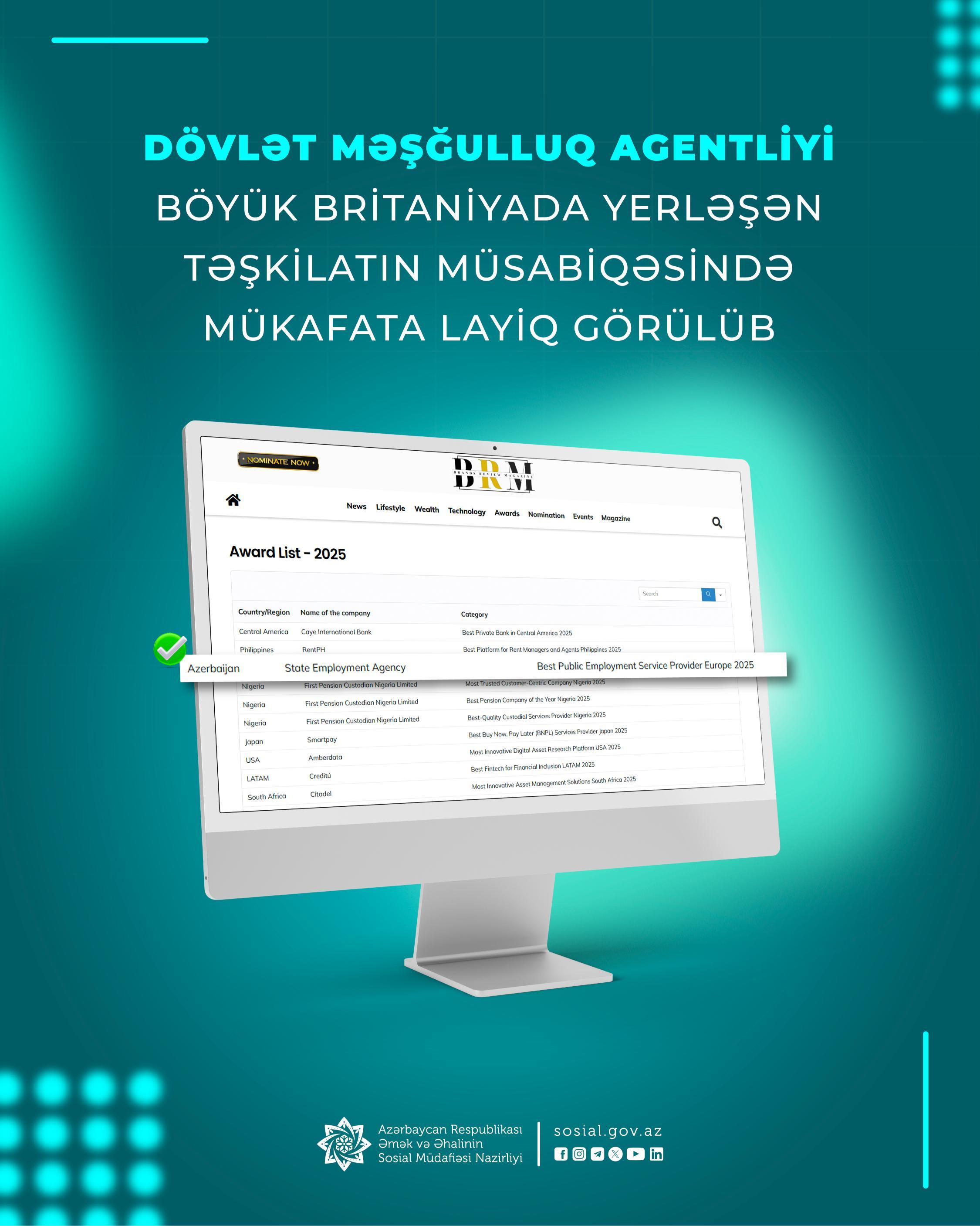 Əmək və Əhalinin Sosial Müdafiəsi Nazirliyinin tabeliyində Dövlət Məşğulluq Agentliyi Böyük Britaniyada fəaliyyət göstərən “Brands Review Magazine” təşkilatının “Brands Review Magazine Awards” müsabiqəsində qalib seçilib.