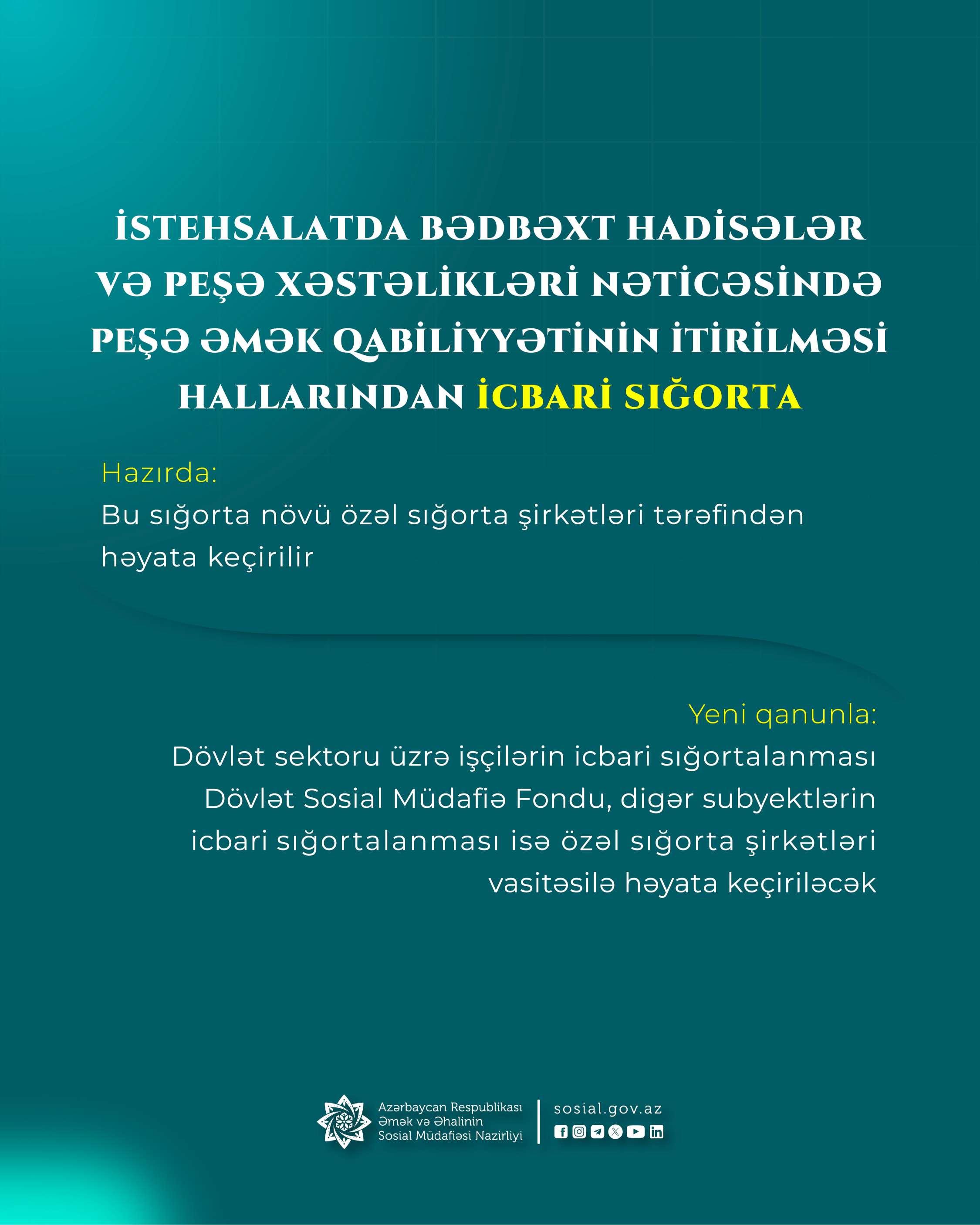 Milli Məclisin qəbul etdiyi yeni qanunlara əsasən, dövlət sektorunda çalışan şəxslərin istehsalatda bədbəxt hadisələr və peşə xəstəlikləri nəticəsində peşə əmək qabiliyyətinin itirilməsi hallarından icbari sığortalanması Dövlət Sosial Müdafiə Fondu (DSMF) vasitəsilə həyata keçiriləcək.