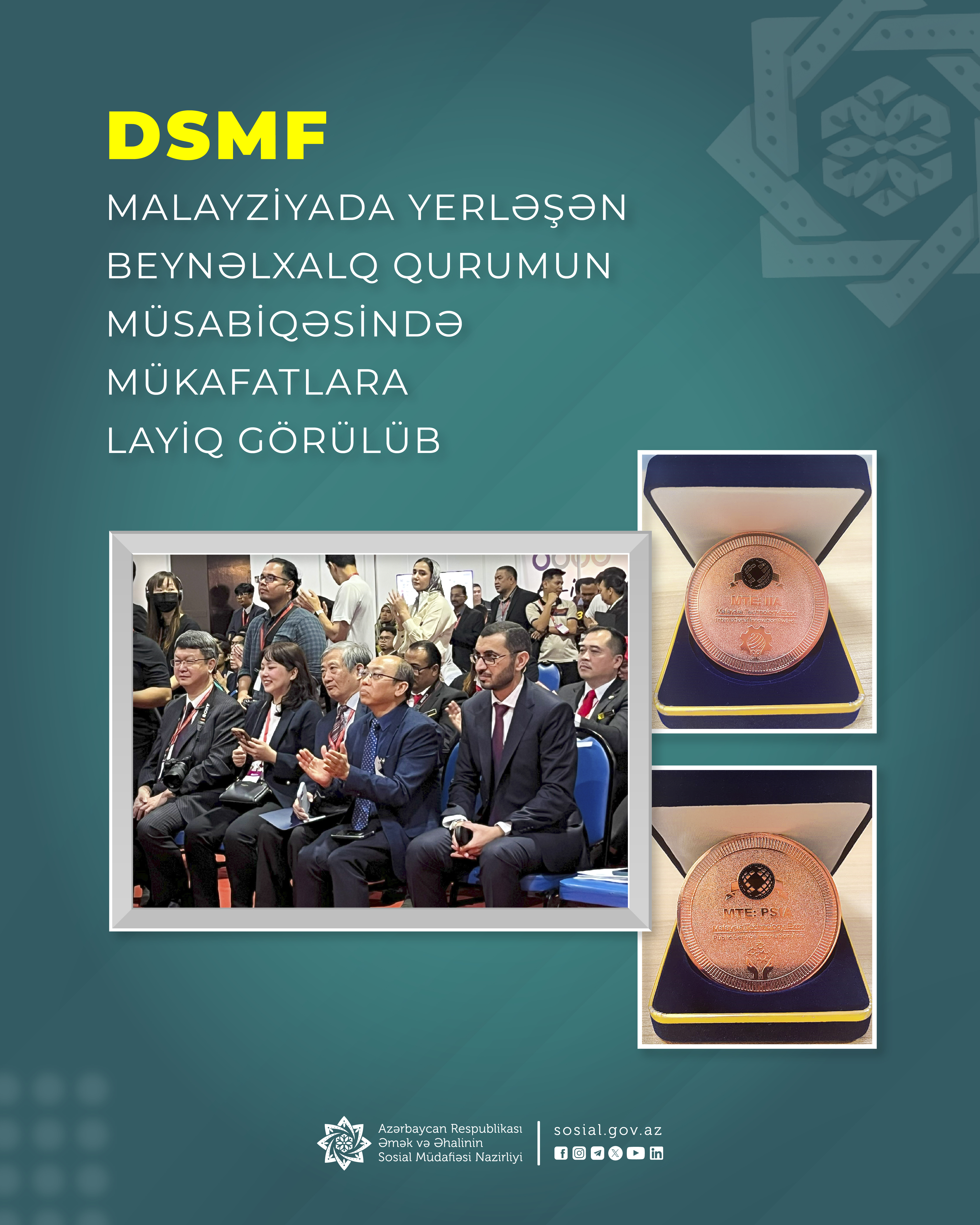 Əmək və Əhalinin Sosial Müdafiəsi Nazirliyinin tabeliyindəki Dövlət Sosial Müdafiə Fondu (DSMF) Malayziyanın “International Professional Trade Exhibition & Meeting Planner” beynəlxalq qurumu tərəfindən keçirilmiş müsabiqədə “Dövlət sektorunda innovasiyalar üzrə mükafat” və “Beynəlxalq innovasiyalar üzrə mükafat” kateqoriyaları üzrə 2 beynəlxalq ali mükafata layiq görülüb.