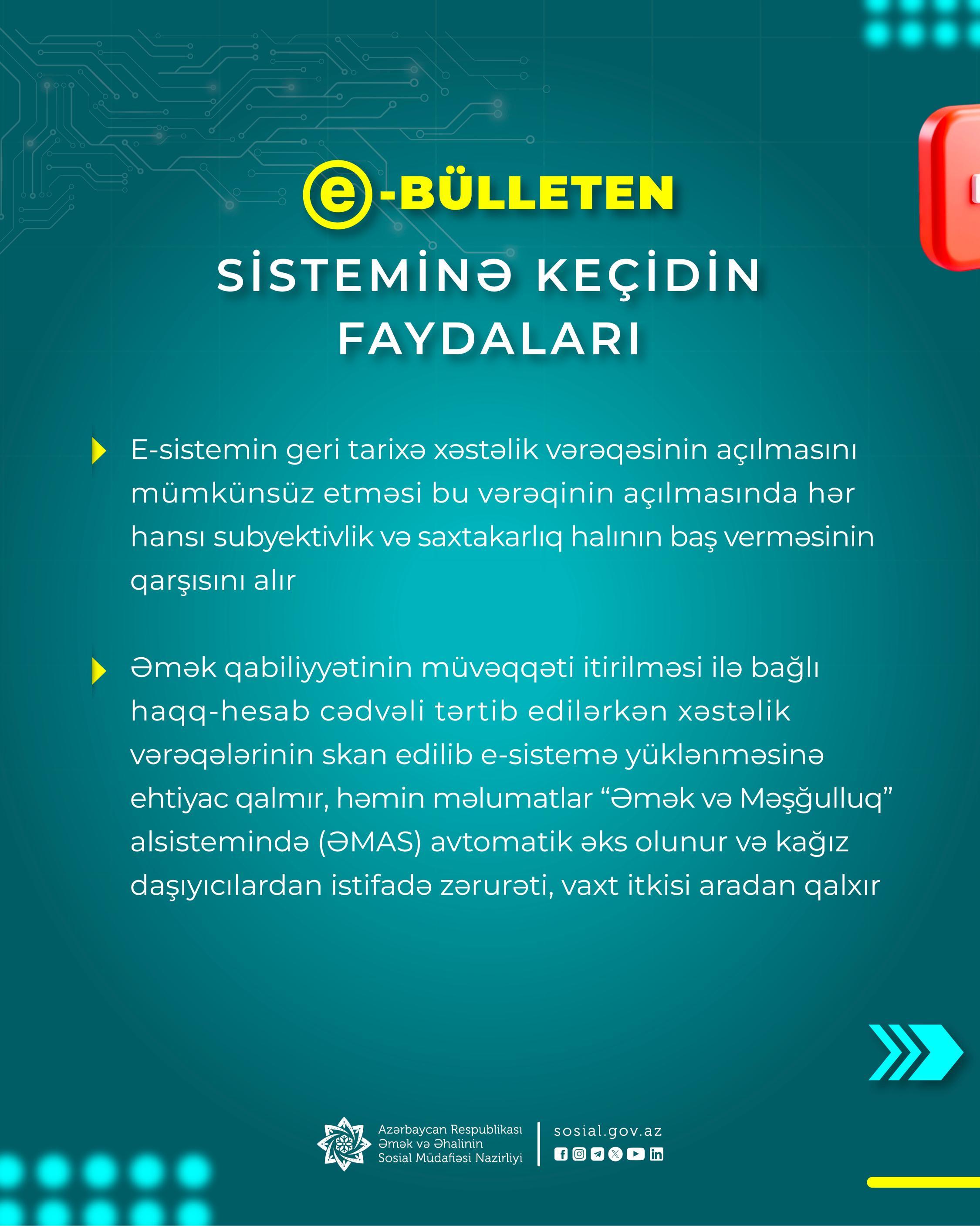 - işəgötürənlər e-bülletenləri ƏMAS-dan, tibb işçiləri isə “e-Səhiyyə” portalı və mobil tətbiqindən asan və rahat əldə edə bilirlər.