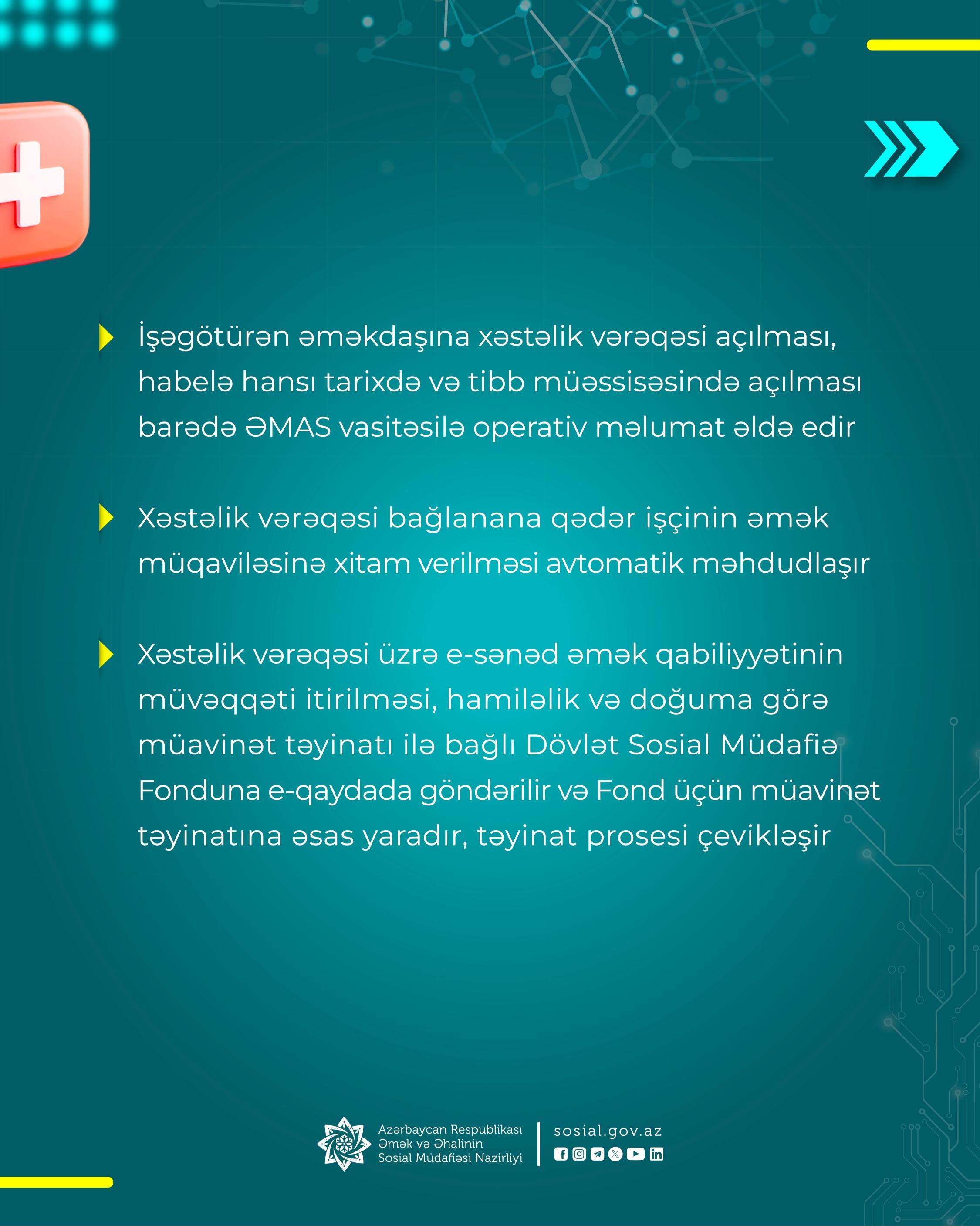 - əmək qabiliyyətinin müvəqqəti itirilməsi ilə bağlı haqq-hesab cədvəli tərtib edilərkən xəstəlik vərəqələrinin skan edilib e-sistemə yüklənməsinə ehtiyac qalmır, həmin məlumatlar “Əmək və Məşğulluq” alsistemində (ƏMAS) avtomatik əks olunur və kağız daşıyıcılardan istifadə zərurəti, vaxt itkisi aradan qalxır;