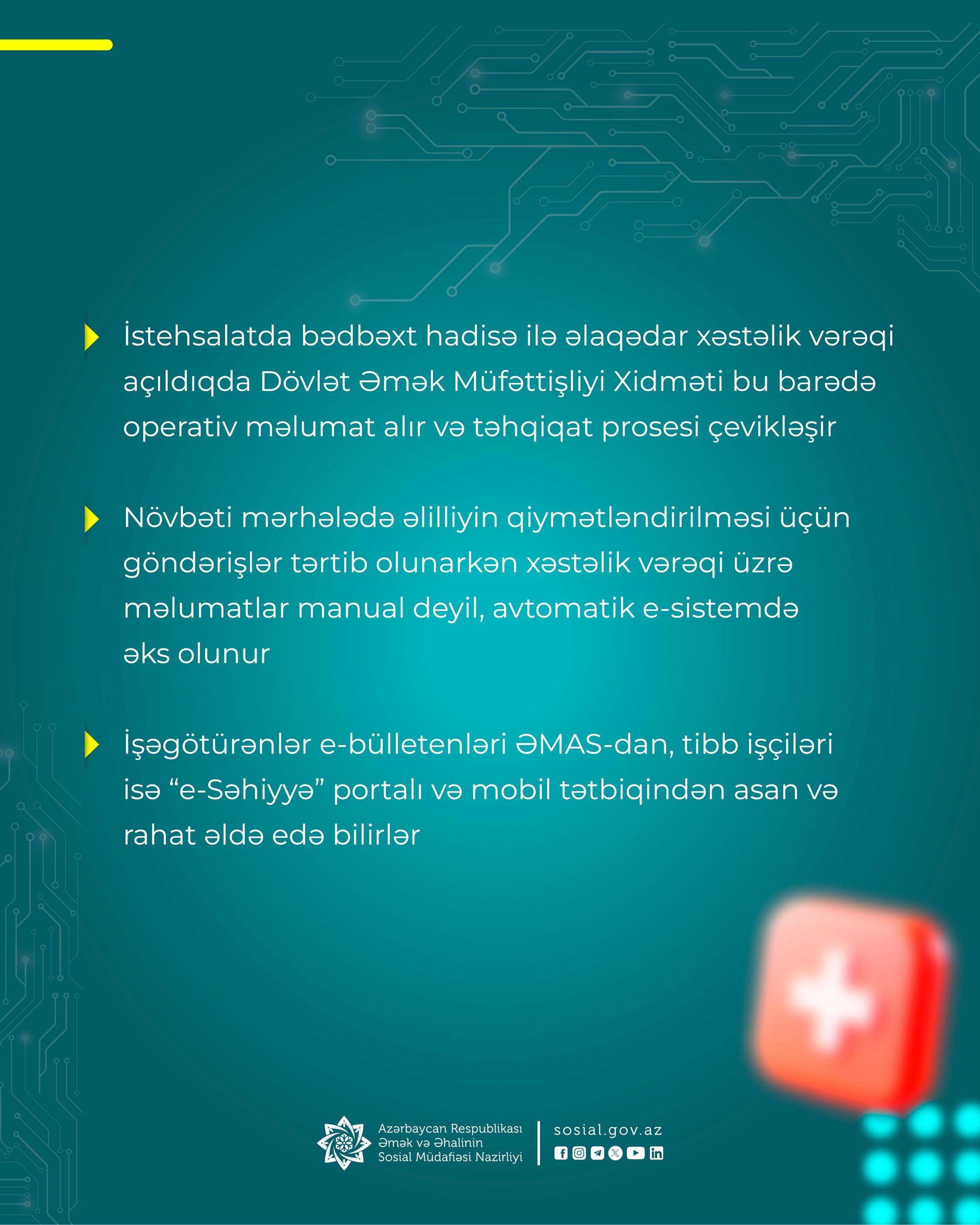 - istehsalatda bədbəxt hadisə ilə əlaqədar xəstəlik vərəqi açıldıqda Dövlət Əmək Müfəttişliyi Xidməti bu barədə operativ məlumat alır və təhqiqat prosesi çevikləşir;