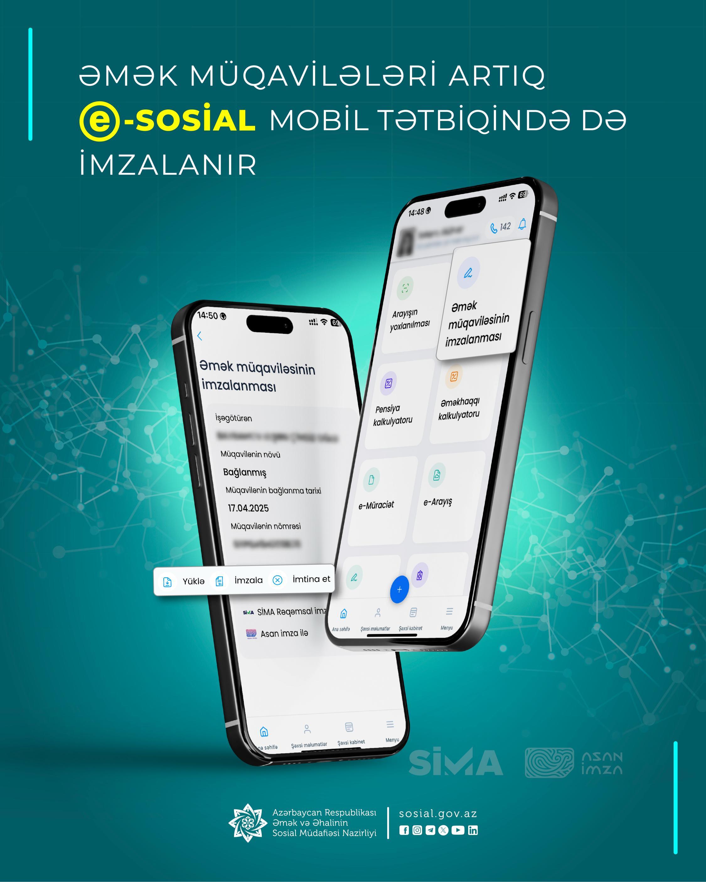 Vətəndaşlar əmək müqavilələrini daha sürətli, sadə və rahat şəkildə Əmək və Əhalinin Sosial Müdafiəsi Nazirliyinin “e-sosial” portalının mobil tətbiqi vasitəsilə də imzalaya bilərlər.