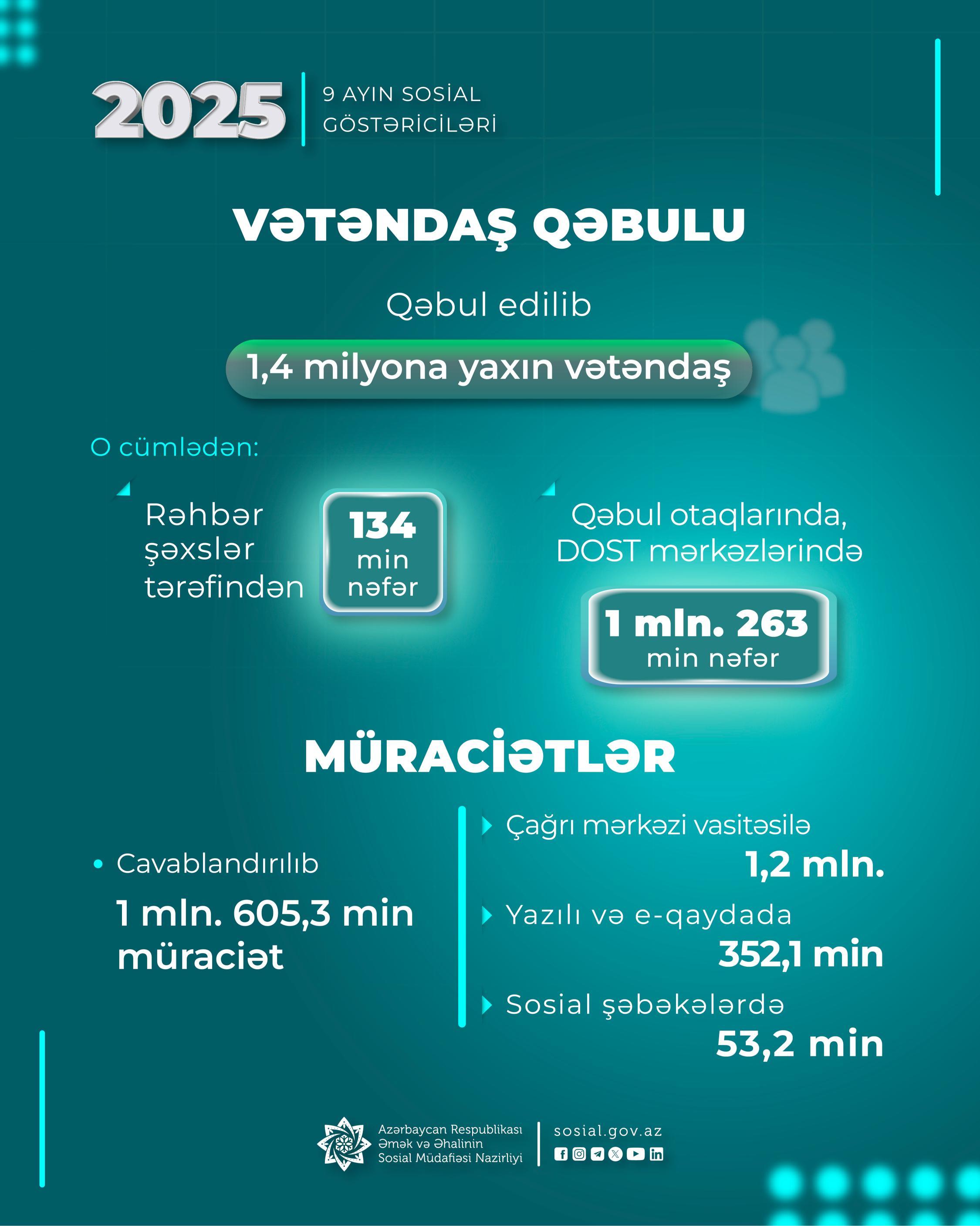 Əmək və Əhalinin Sosial Müdafiəsi Nazirliyi və qurumları tərəfindən bu ilin 9 ayında 1,4 milyona yaxın vətəndaşın qəbulu həyata keçirilib.