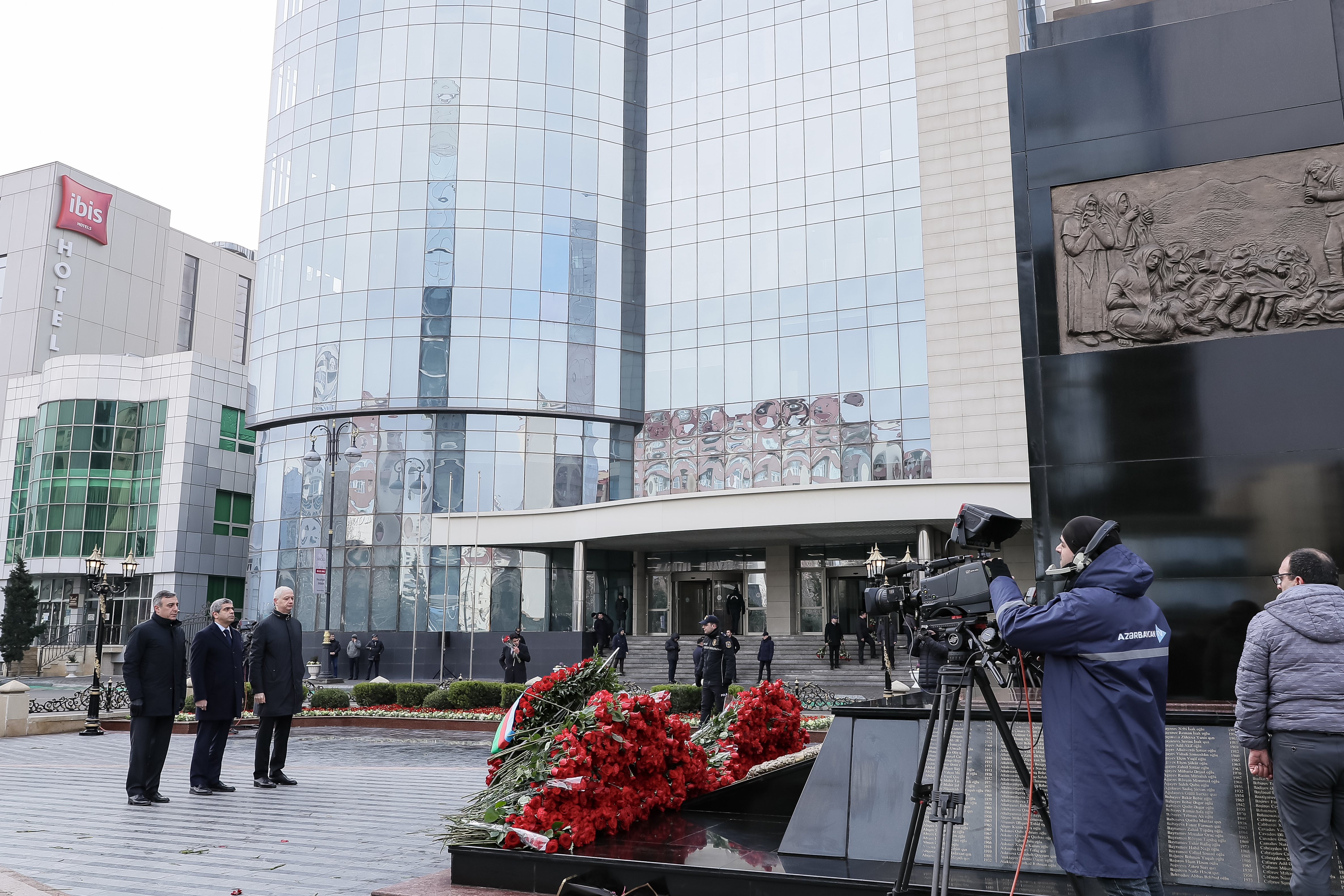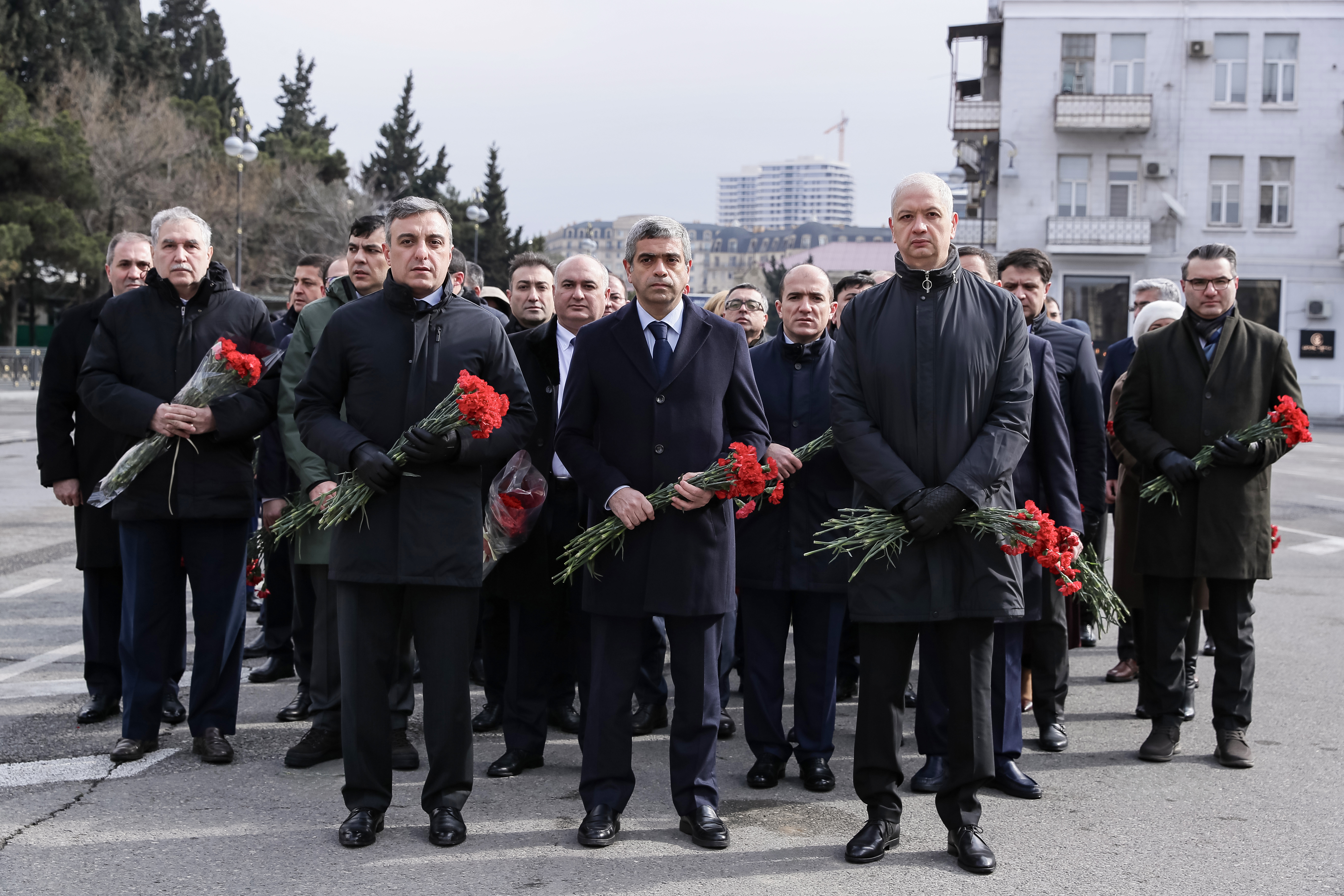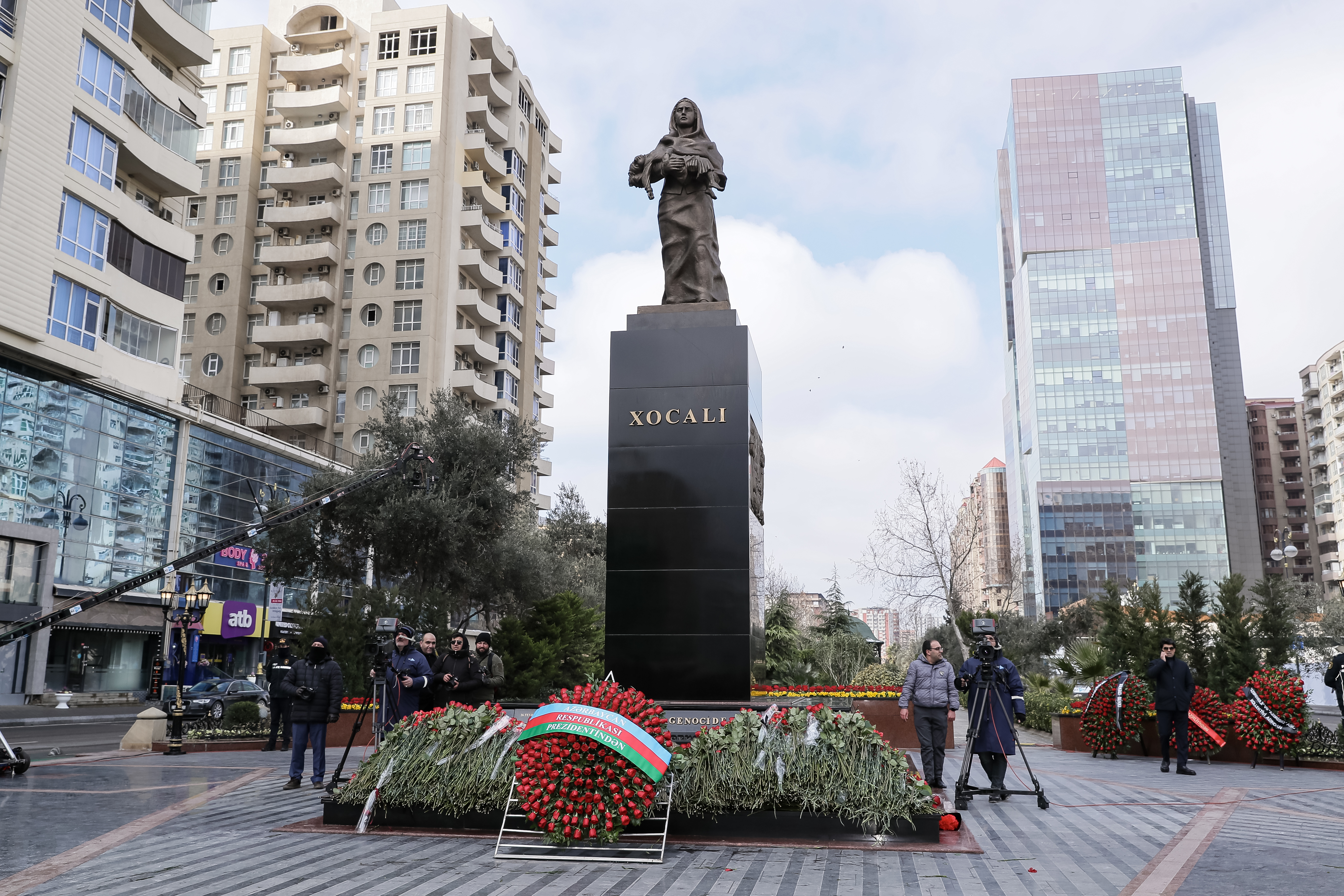Abidənin önünə gül dəstələri düzülüb, Xocalı soyqırımı qurbanlarının əziz xatirəsi ehtiramla yad edilib.