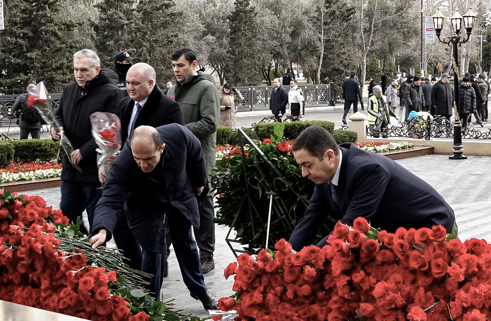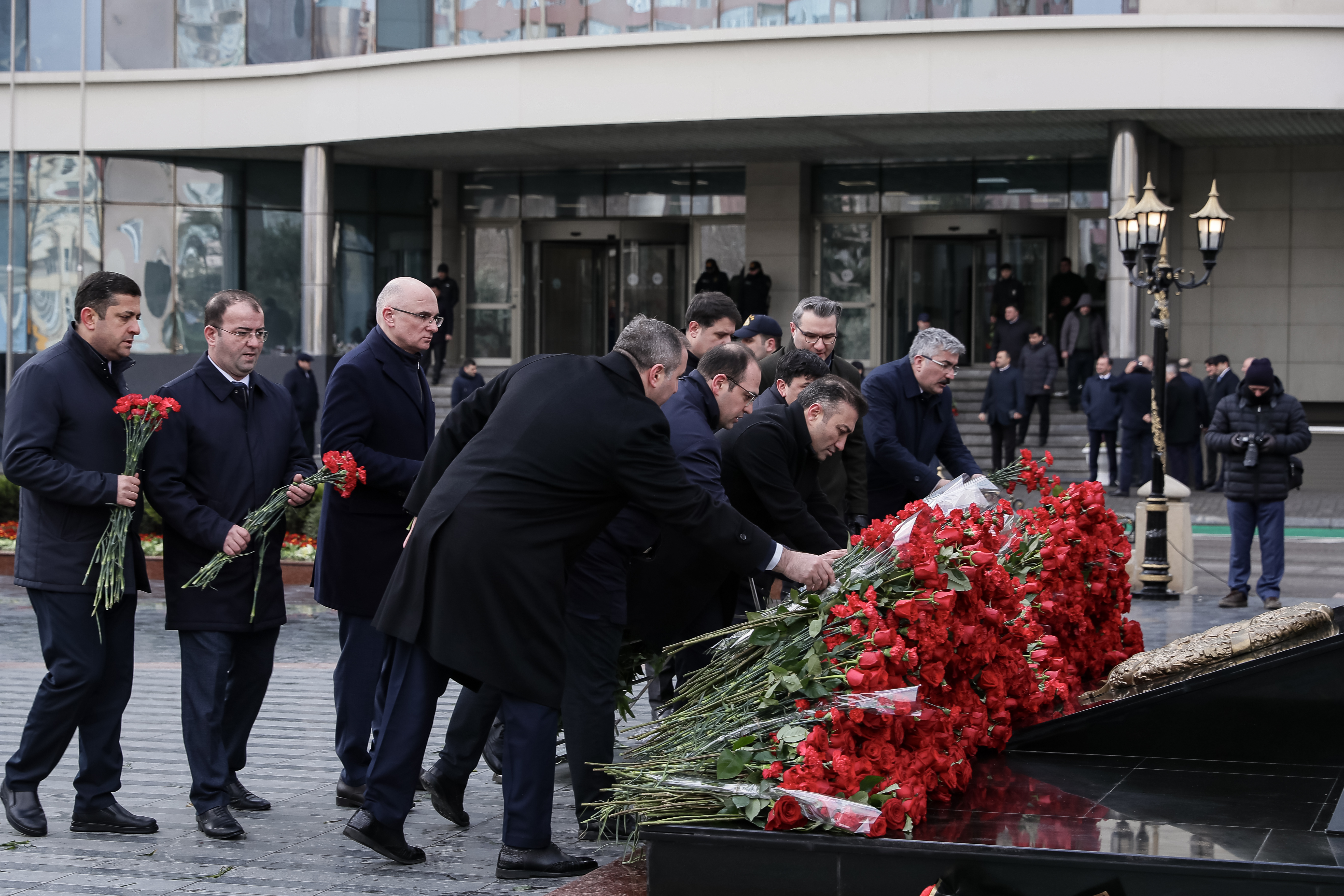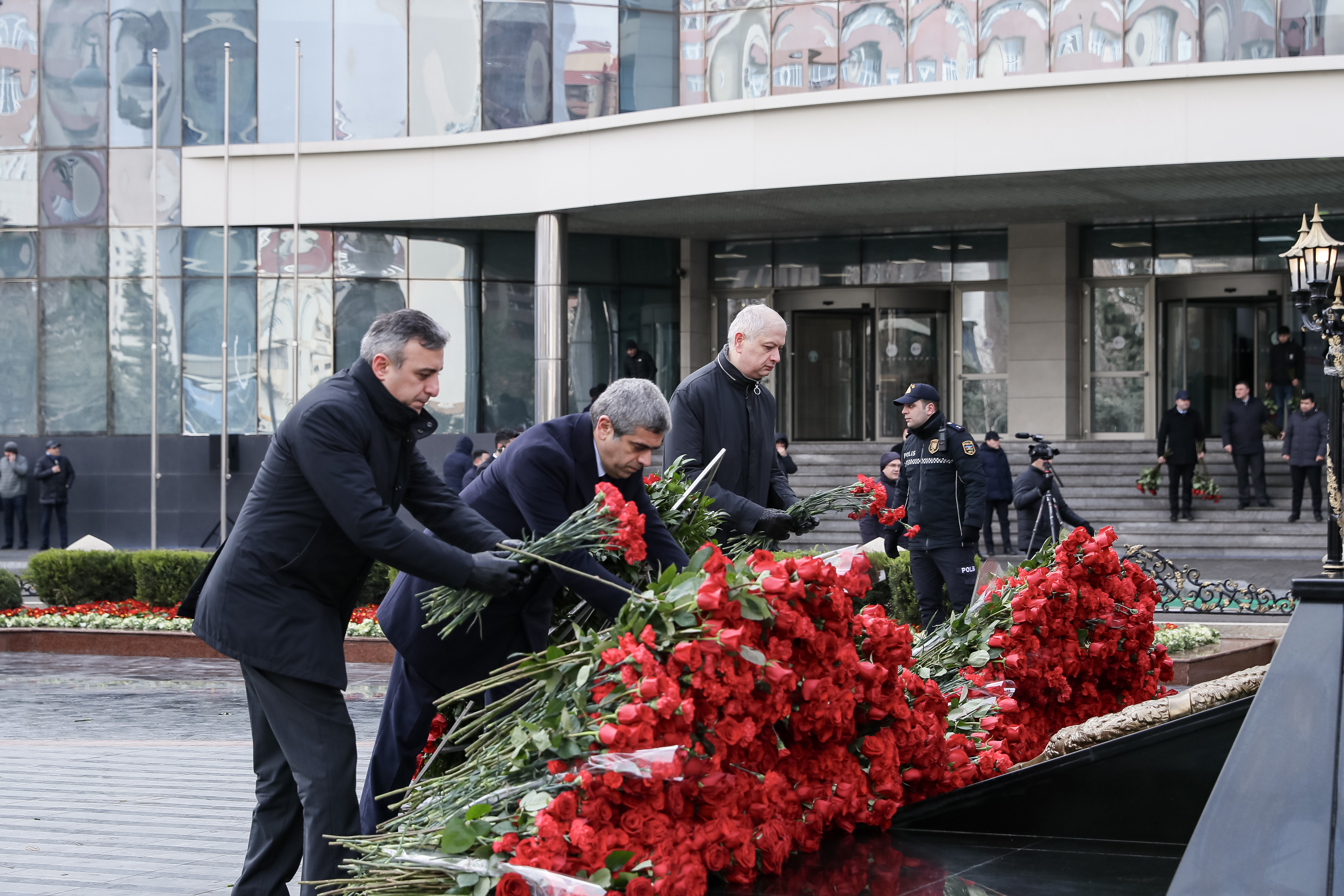 Abidənin önünə gül dəstələri düzülüb, Xocalı soyqırımı qurbanlarının əziz xatirəsi ehtiramla yad edilib.