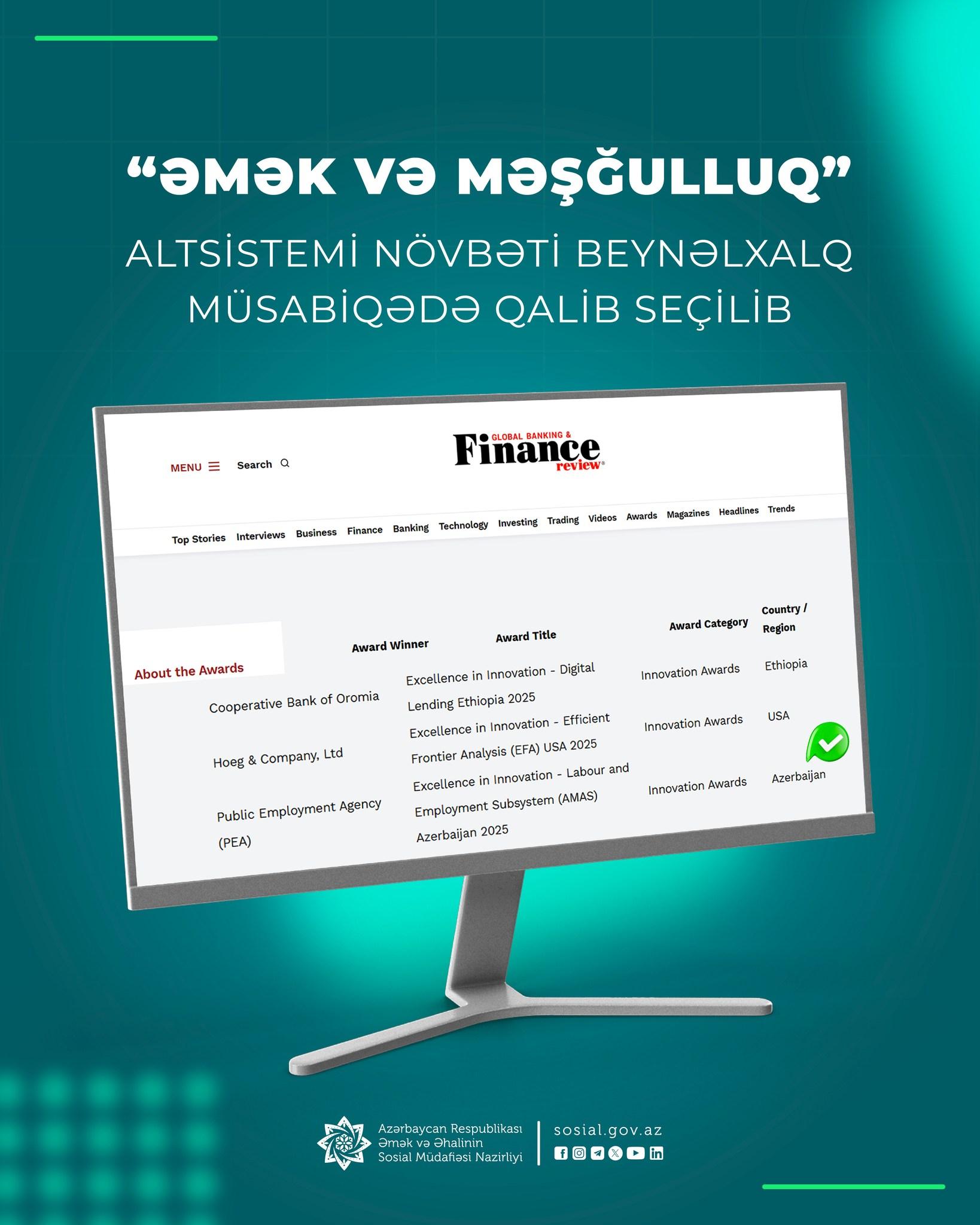 Agentliyin “Əmək və məşğulluq” altsistemi (ƏMAS) qurum tərəfindən təşkil edilən Global Banking & Finance Awards” müsabiqəsində “İnnovasiyada Mükəmməllik” kateqoriyası üzrə qalib seçilib. (https://www.globalbankingandfinance.com/global-banking-finance-awards-2025-award-winners)