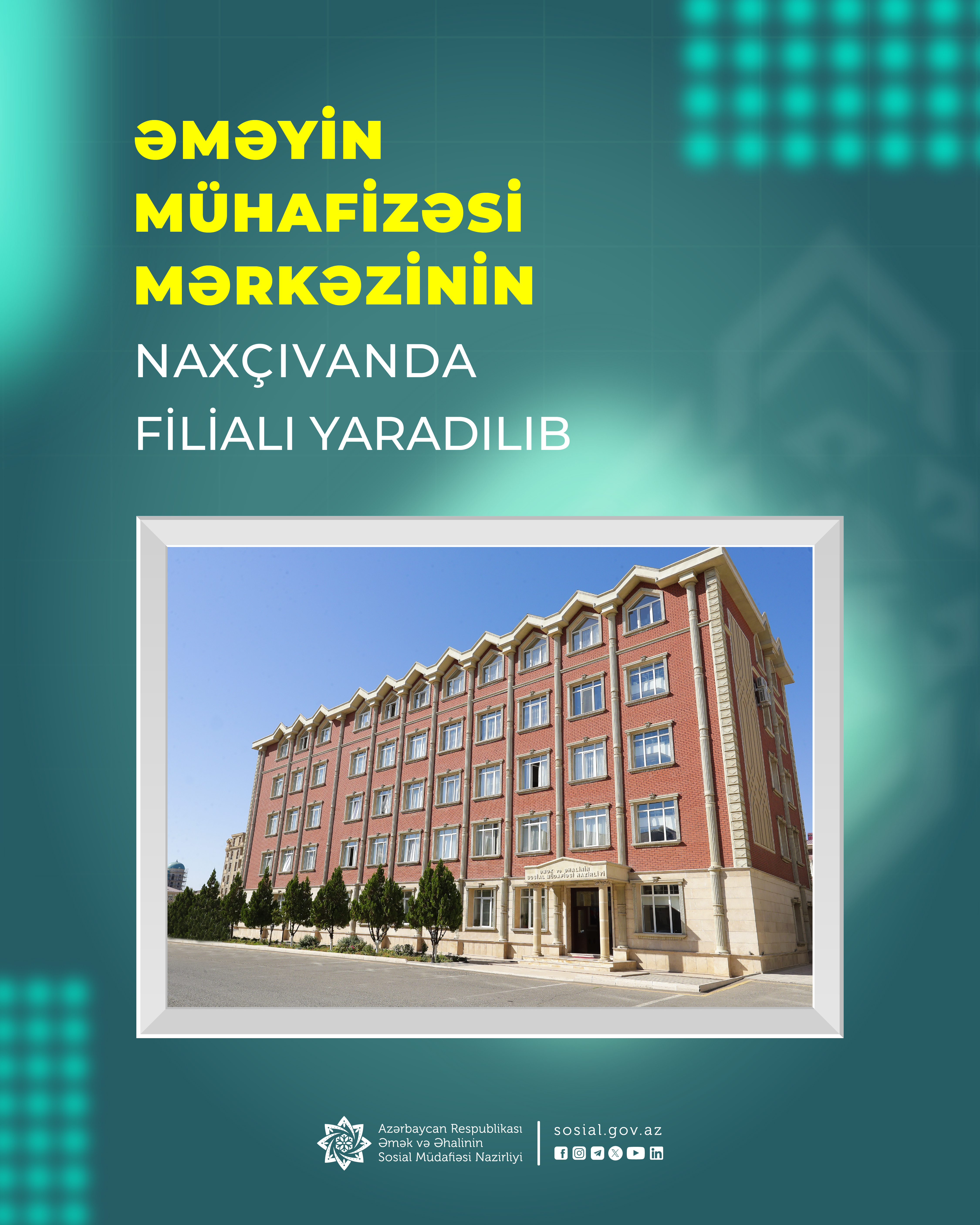 Əmək və Əhalinin Sosial Müdafiəsi Nazirliyi yanında Dövlət Əmək Müfəttişliyi Xidmətinin tabeliyindəki “Əməyin Mühafizəsi Mərkəzi” publik hüquqi şəxsin Naxçıvan Muxtar Respublikasında filialı fəaliyyətə başlayıb.