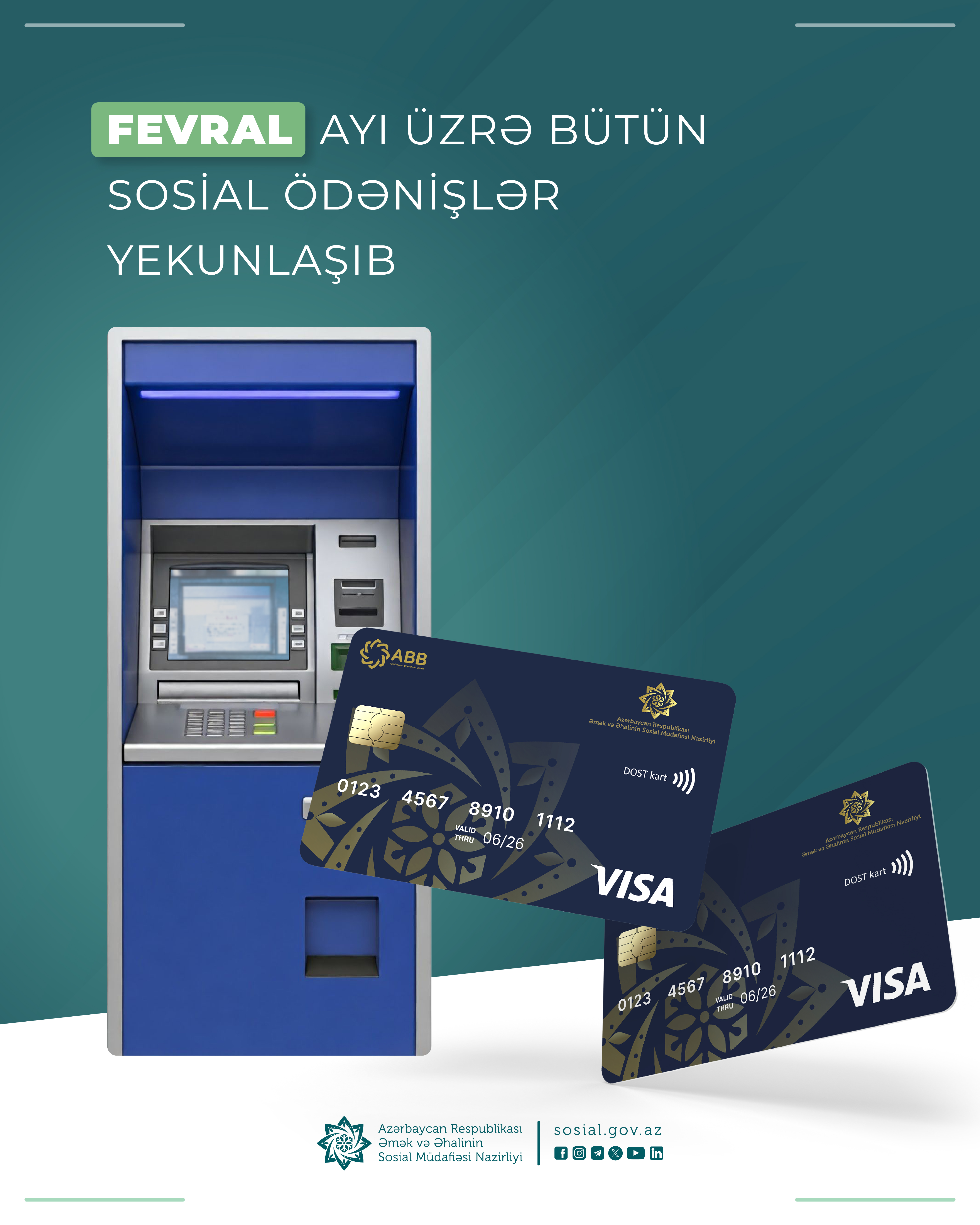 Əmək və Əhalinin Sosial Müdafiəsi Nazirliyinin tabeliyində Dövlət Sosial Müdafiə Fondu tərəfindən fevral ayının müavinət, təqaüd və ünvanlı dövlət sosial yardımları da ödənilib.