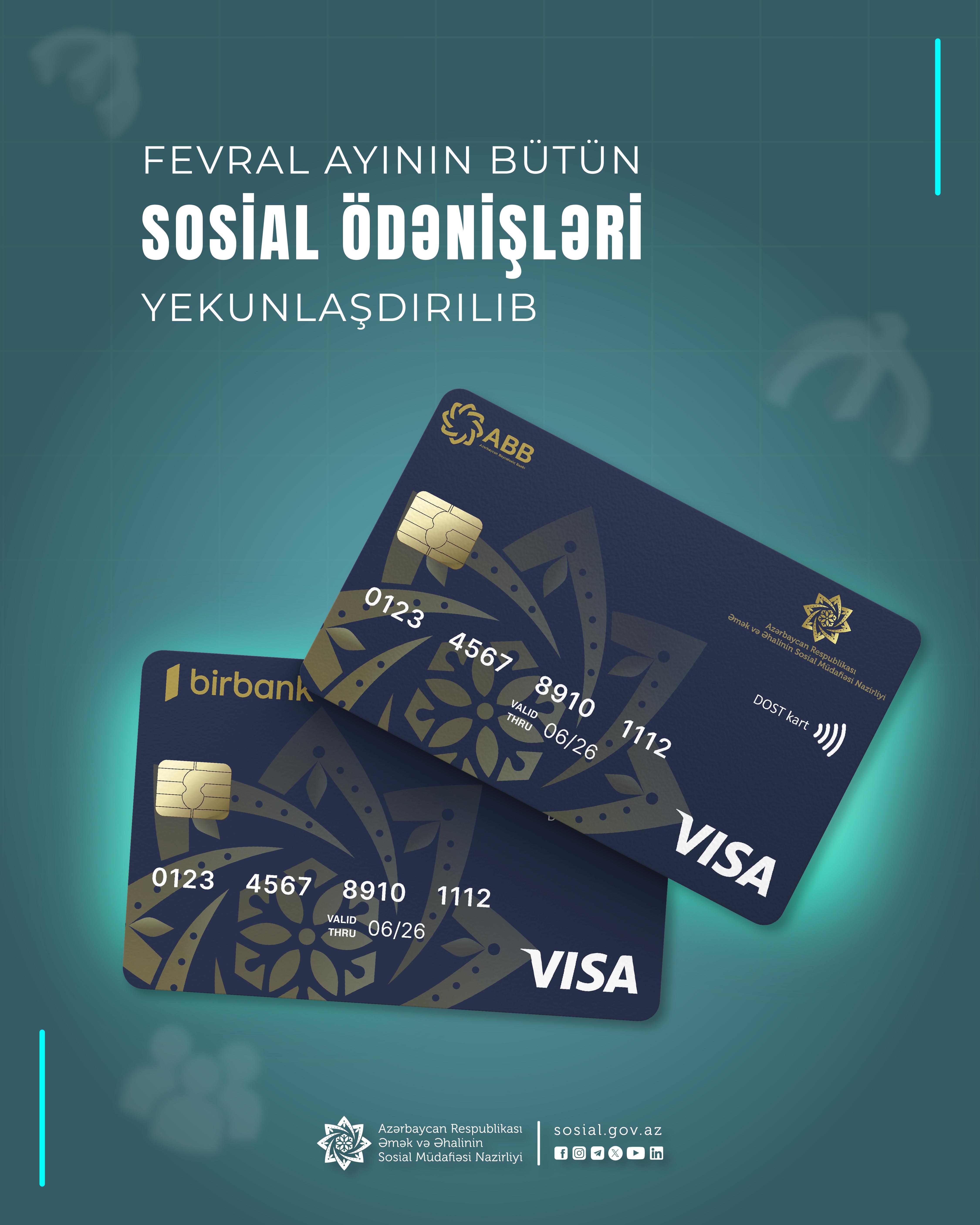 Əmək və Əhalinin Sosial Müdafiəsi Nazirliyinin tabeliyində Dövlət Sosial Müdafiə Fondu tərəfindən bu gün fevral ayının müavinət, təqaüd və ünvanlı dövlət sosial yardımları ödənilib.