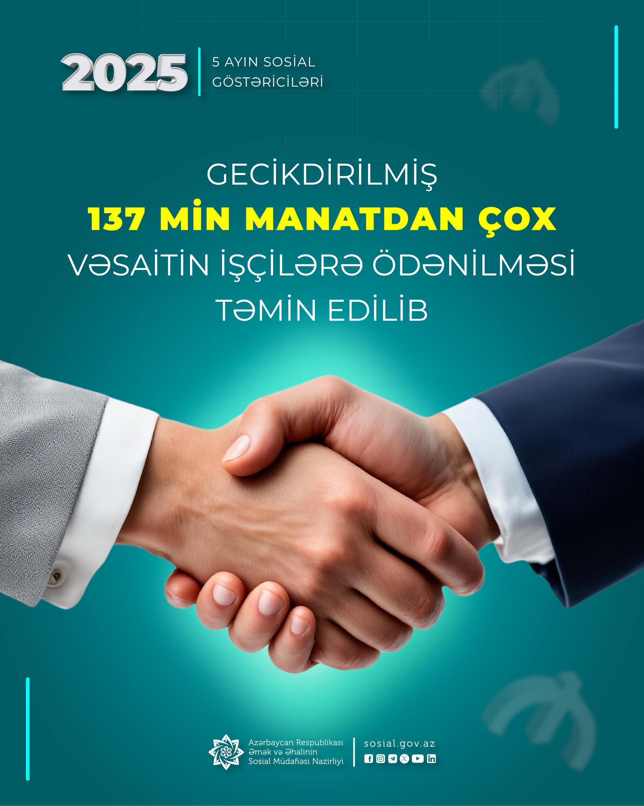 Əmək və Əhalinin Sosial Müdafiəsi Nazirliyi yanında Dövlət Əmək Müfəttişliyi Xidməti 2025-ci ilin yanvar-may ayları ərzində işəgötürənlər tərəfindən sosial xarakterli ödənişlər olan 137 176 manat vəsaitin işçilərə ödənilməsinin gecikdirildiyini müəyyən edib.