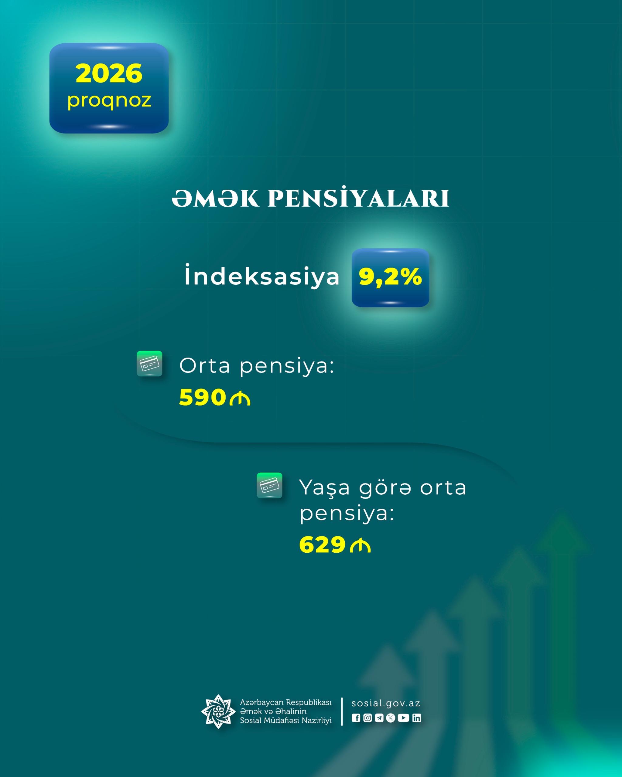 Pensiyalarda artım dinamikası 2026-cı ildə də davam edəcək. Proqnoz göstəricilərə görə, gələn il pensiyaların indeksasiyasının təqribən 9,2 faiz səviyyəsində olması, orta aylıq pensiyanın 9,2 faiz artımla 590 manata, yaşa görə orta aylıq pensiyanın 629 manata çatması gözlənilir.
