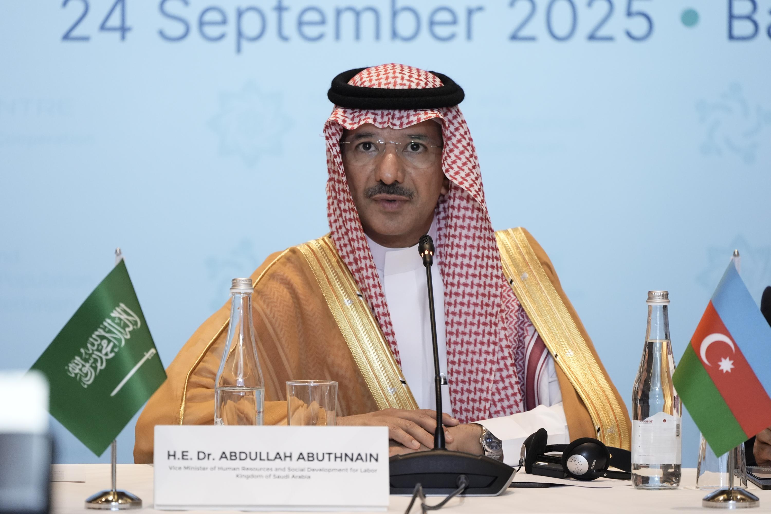 Səudiyyə Ərəbistanı Krallığının insan resursları və sosial inkişaf nazirinin müavini Abdullah Nasser M.Abuthnain “Əmək və Məşğulluq Sistemlərinin Transformasiyası: Çağırışlardan İmkanlara” mövzusunda çıxış edərək fikirlərini bölüşüb.