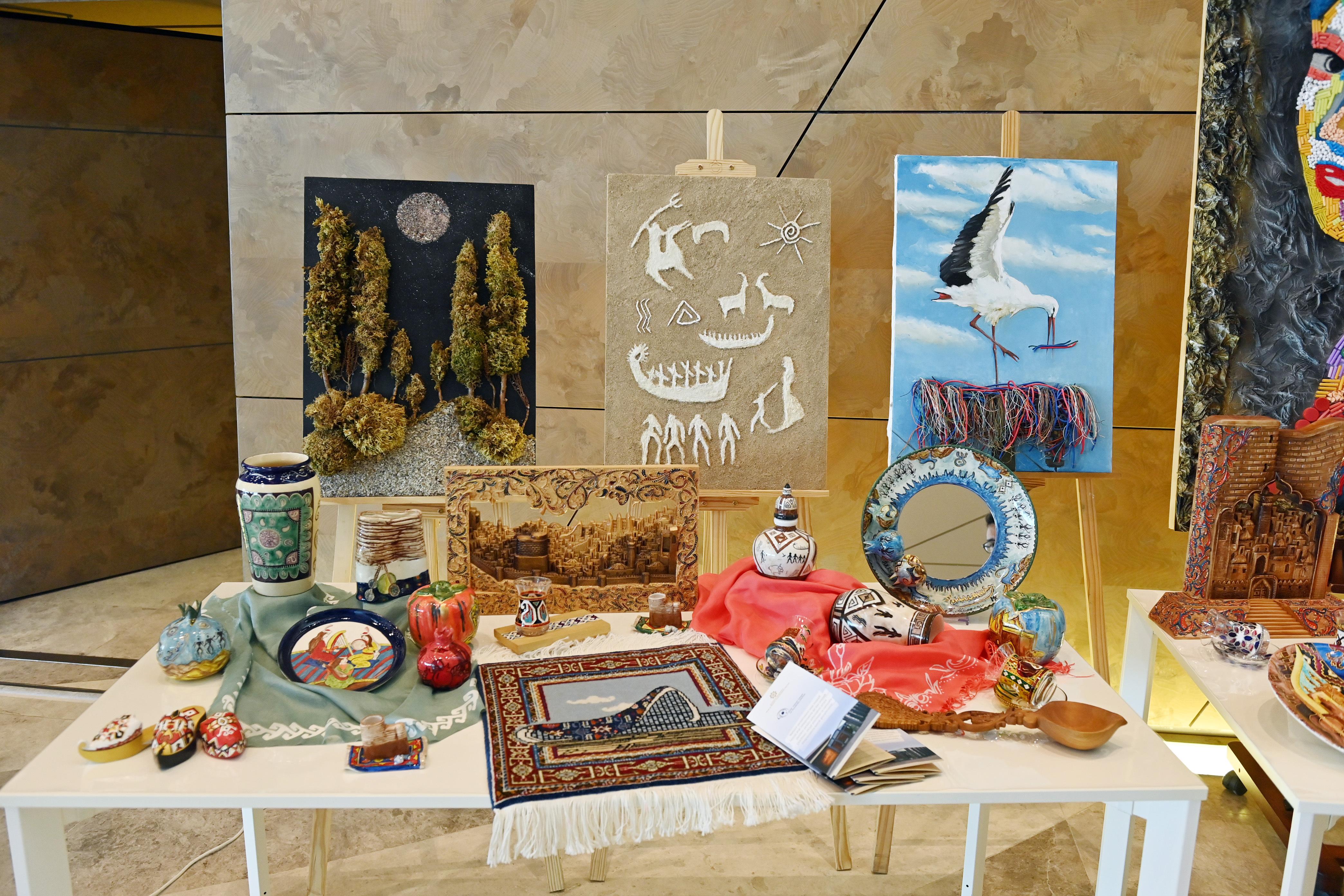 Ekspozisiyada bədii tikmə və oymaçılıq, təsviri incəsənət, dulusçuluq, floristika, xalçaçılıq nümunələri sərgilənib.