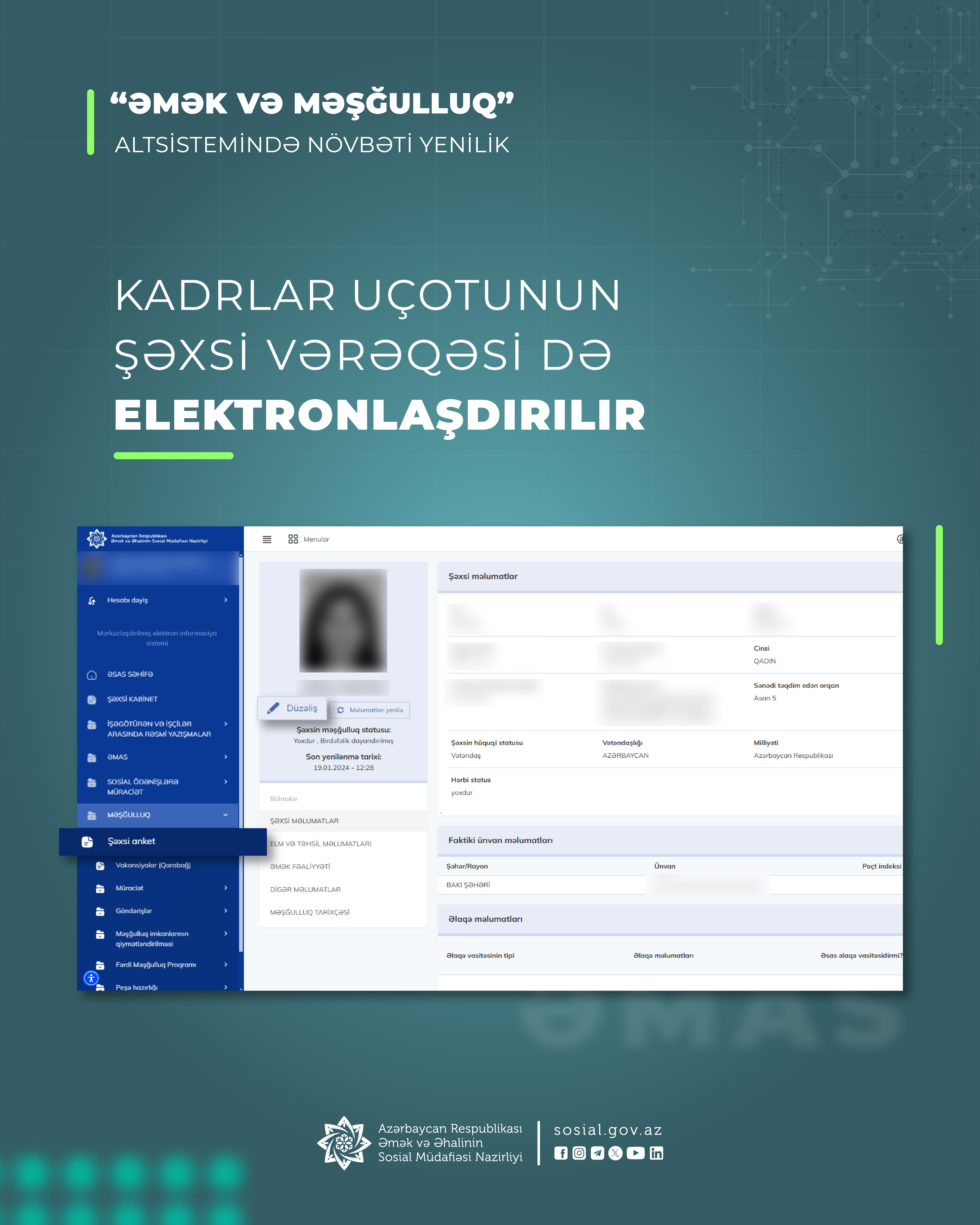 “Kadrlar uçotunun şəxsi vərəqəsi” işəgötürənlərə elektron formada təqdim olunacaq. Bu məqsədlə Əmək və Əhalinin Sosial Müdafiəsi Nazirliyinin “Əmək və Məşğulluq” altsistemində (ƏMAS) yeni funksionallıq yaradılır.