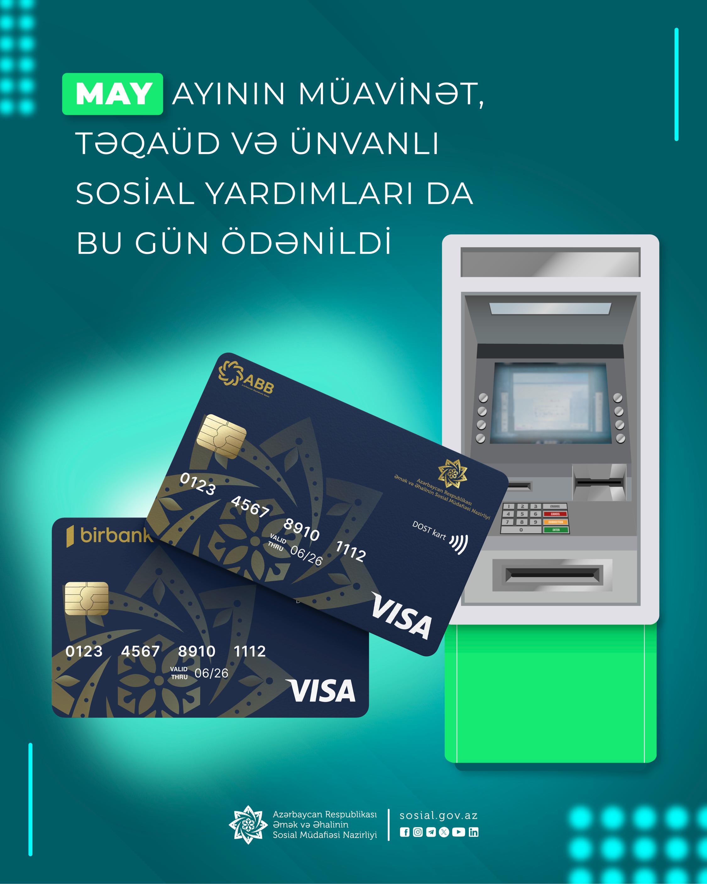 Əmək və Əhalininin Sosial Müdafiəsi Nazirliyinin tabeliyində Dövlət Sosial Müdafiə Fondun tərəfindən may ayının müavinət, təqaüd və ünvanlı dövlət sosial yardımları da bu gün ödənilib.