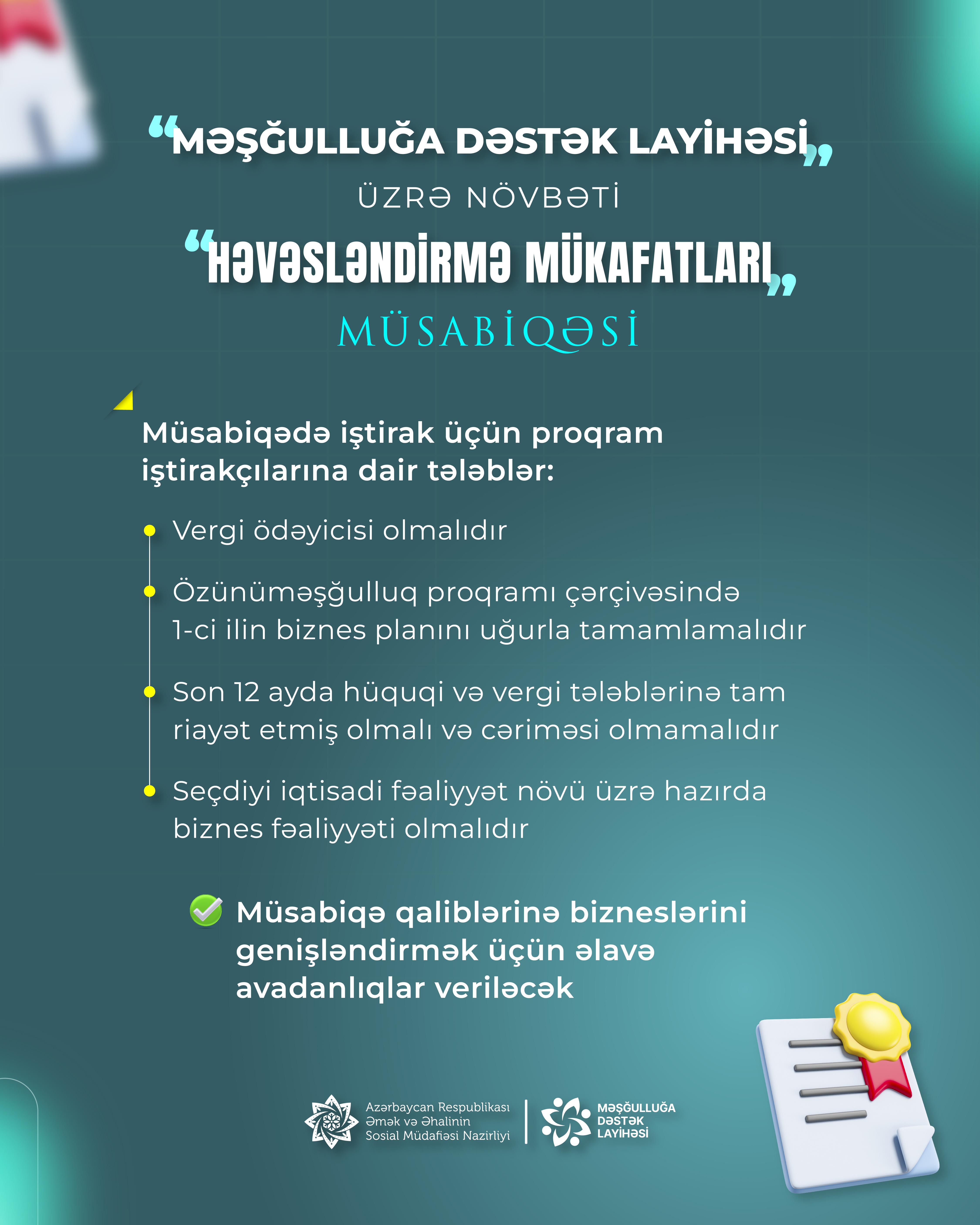Müsabiqəyə ölkənin bütün şəhər və rayonları üzrə “Məşğulluğa Dəstək Layihəsi” çərçivəsində kiçik biznesini qurmuş şəxslər müraciət edə bilər.