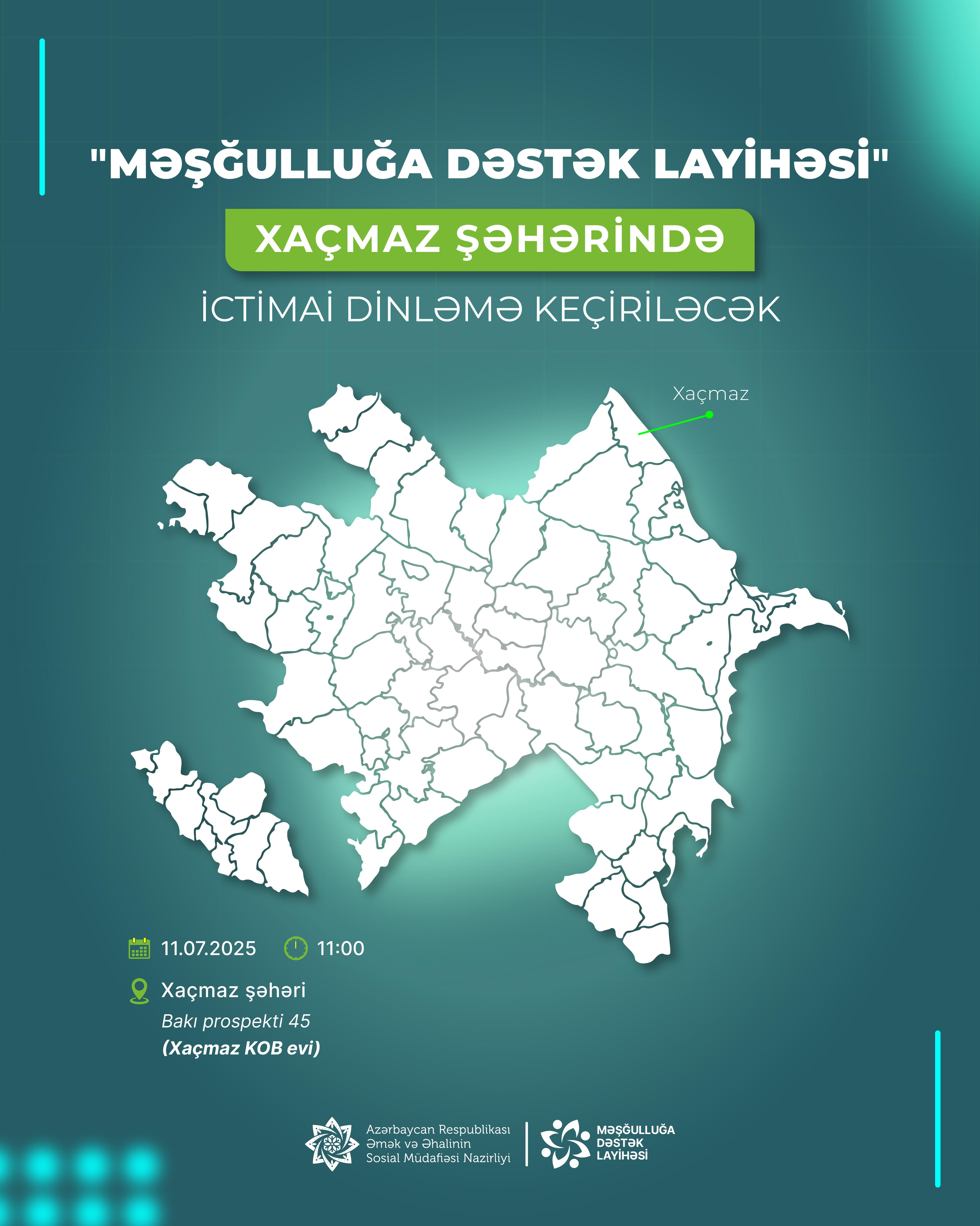 İctimai dinləmə 11 iyul 2025-ci il tarixində, saat 11:00-da Xaçmaz şəhəri, Bakı prospekti 45 ünvanında yerləşən Xaçmaz KOB evinin akt zalında keçiriləcək.