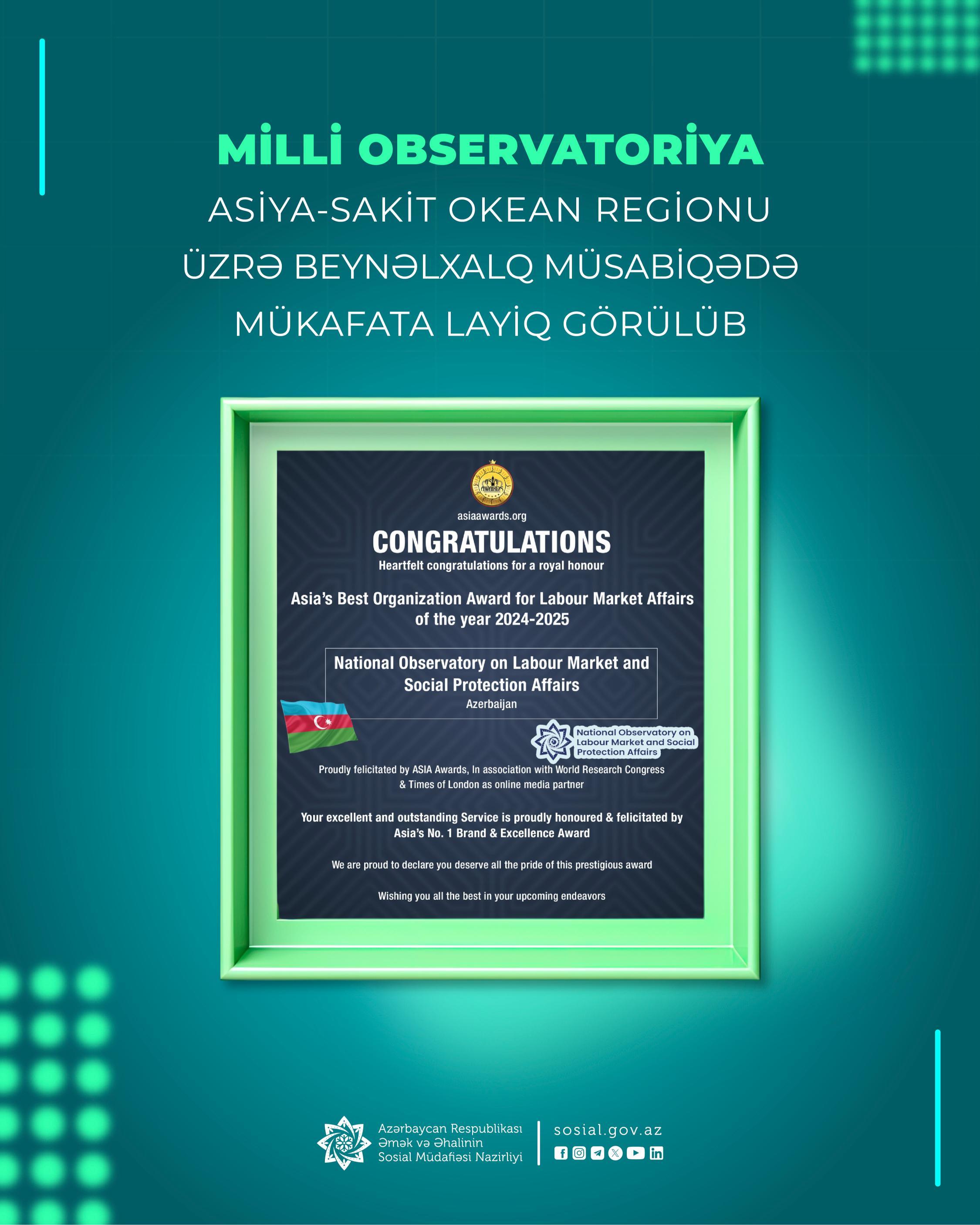 Əmək və Əhalinin Sosial Müdafiəsi Nazirliyinin tabeliyində Əmək Bazarı və Sosial Müdafiə Məsələləri üzrə Milli Observatoriya Asiya-Sakit Okean regionu üzrə keçirilən nüfuzlu “Asiya Mükafatı” (“Asia Awards”) beynəlxalq qiymətləndirmə müsabiqəsində “Asiyanın əmək bazarı üzrə ən yaxşı təşkilatı” mükafatına layiq görülüb.