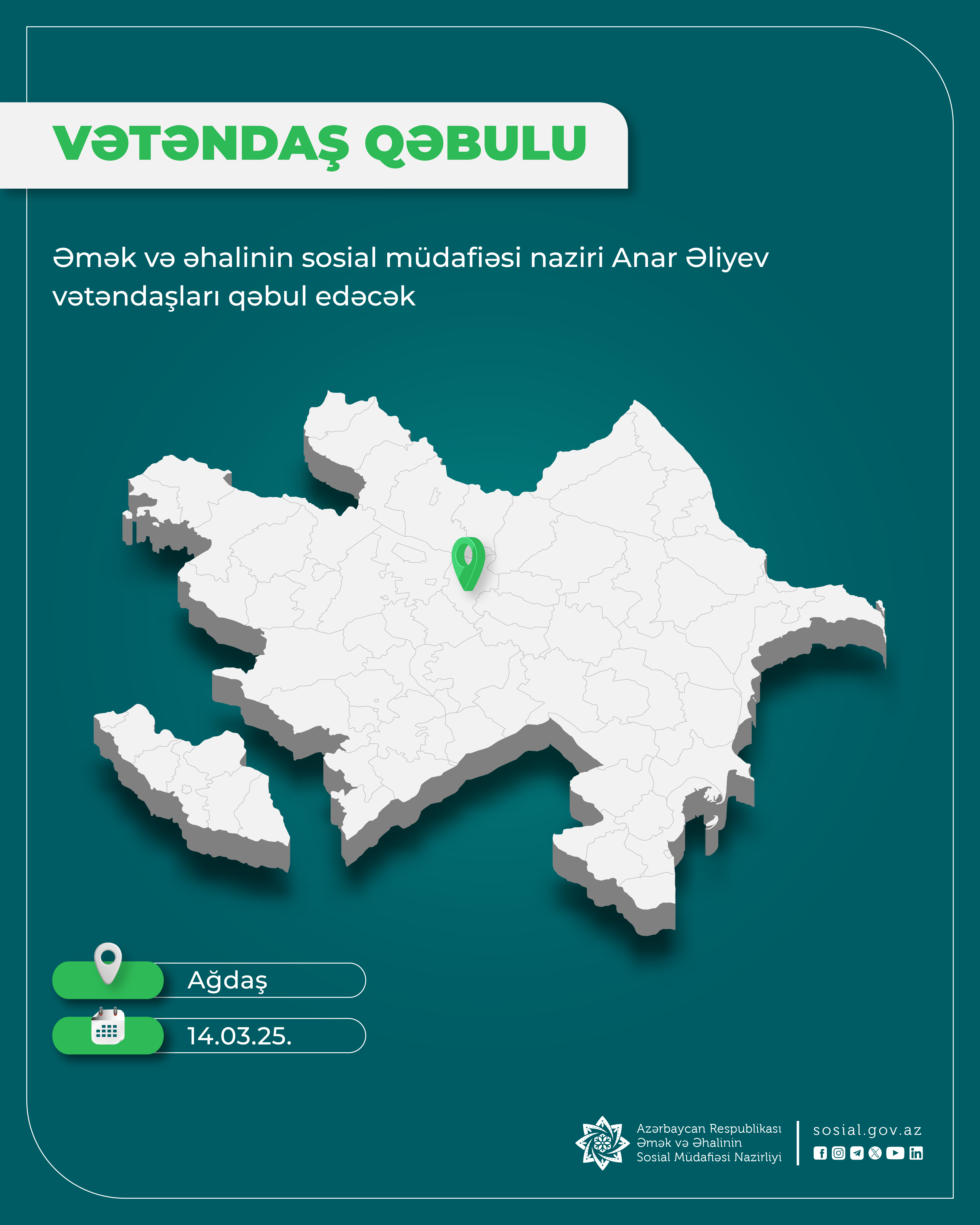 Əmək və əhalinin sosial müdafiəsi naziri Anar Əliyev martın 14-də Ağdaş rayonunda Ağdaş və Yevlax rayonlarının sakinlərini qəbul edəcək.