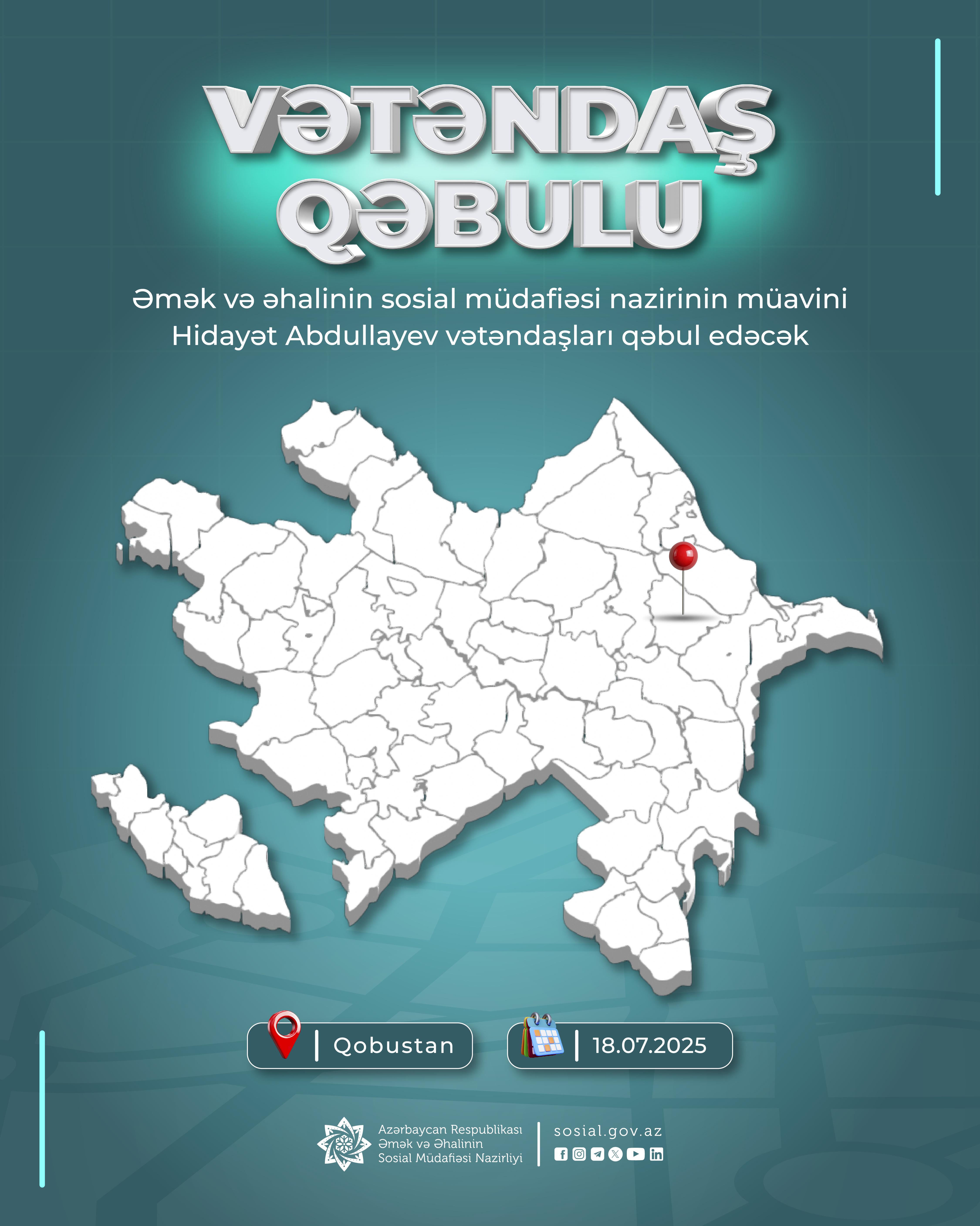 Əmək və əhalinin sosial müdafiəsi nazirinin müavini Hidayət Abdullayev iyulun 18-də Qobustan rayonunda sakinləri qəbul edəcək.