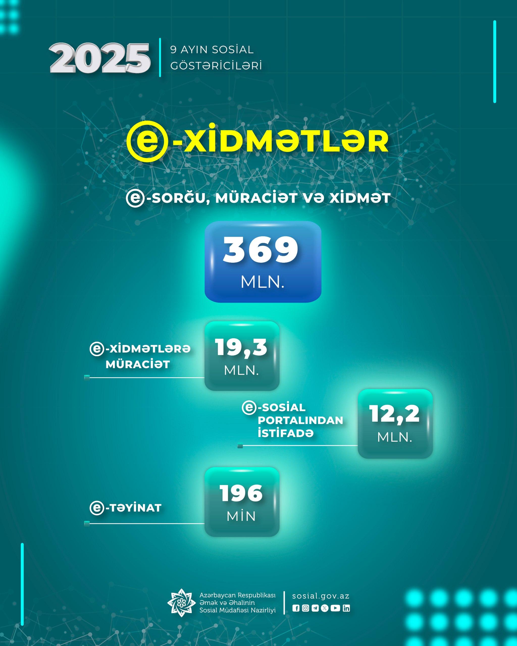 Əmək və Əhalinin Sosial Müdafiəsi Nazirliyinin fəaliyyət sahələri üzrə əhaliyə təqdim olunan elektron xidmətlərə bu ilin yanvar-sentyabr aylarında 19,3 milyon müraciət edilib.