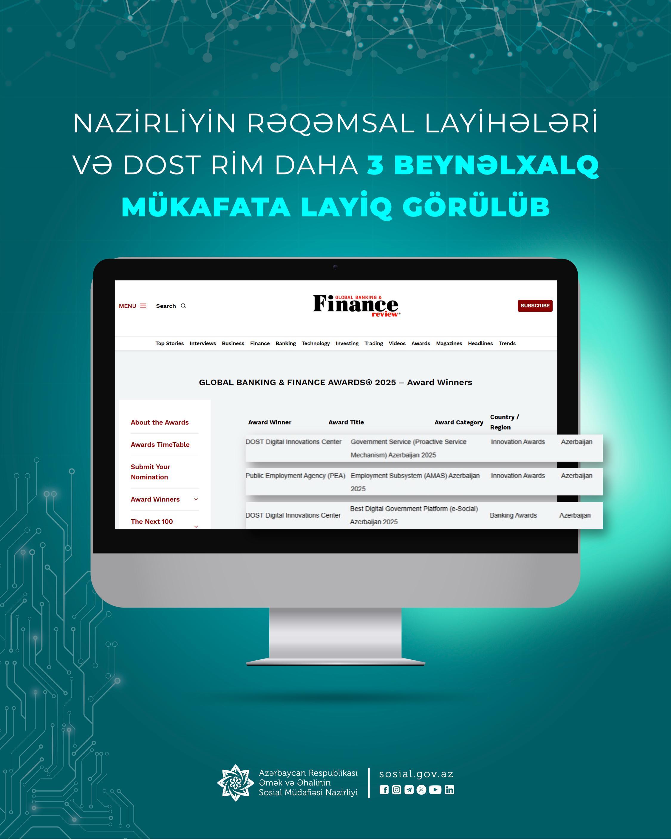 Əmək və Əhalinin Sosial Müdafiəsi Nazirliyinin “e-Sosial” portalı, proaktiv xidmət mexanizmləri və Nazirliyin tabeliyindəki DOST Rəqəmsal İnnovasiyalar Mərkəzinin (DOST RİM) fəaliyyəti Böyük Britaniyanın “Global Banking & Finance Review” beynəlxalq qurumunun “Global Banking & Finance Awards” müsabiqəsində 3 kateqoriya üzrə mükafatlara layiq görülüb: