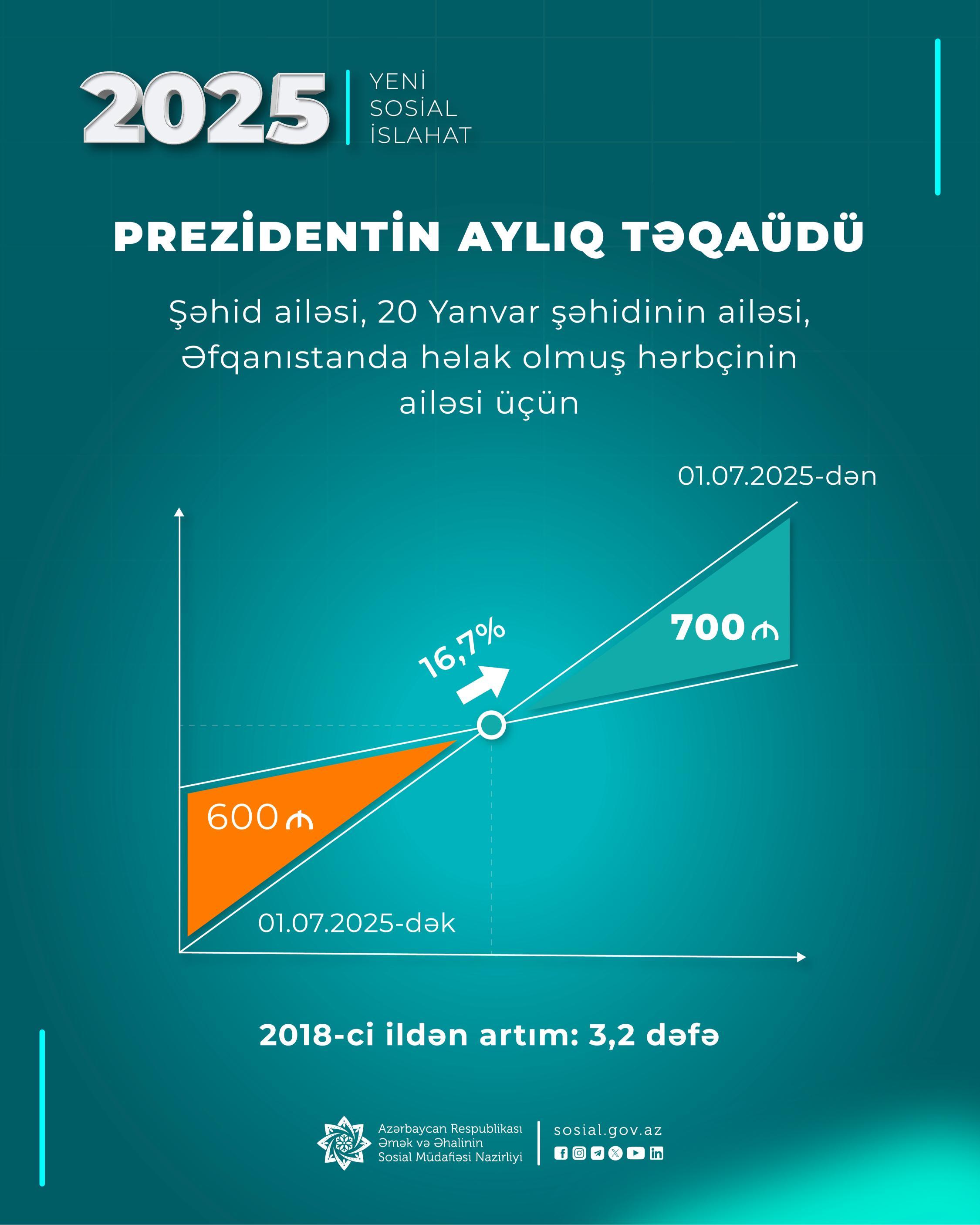 - Şəhid ailəsi, 20 Yanvar şəhidinin ailəsi, Əfqanıstanda həlak olan hərbçilərin ailələri üçün Prezidentin aylıq təqaüdü – 700 manata çatdırılır;