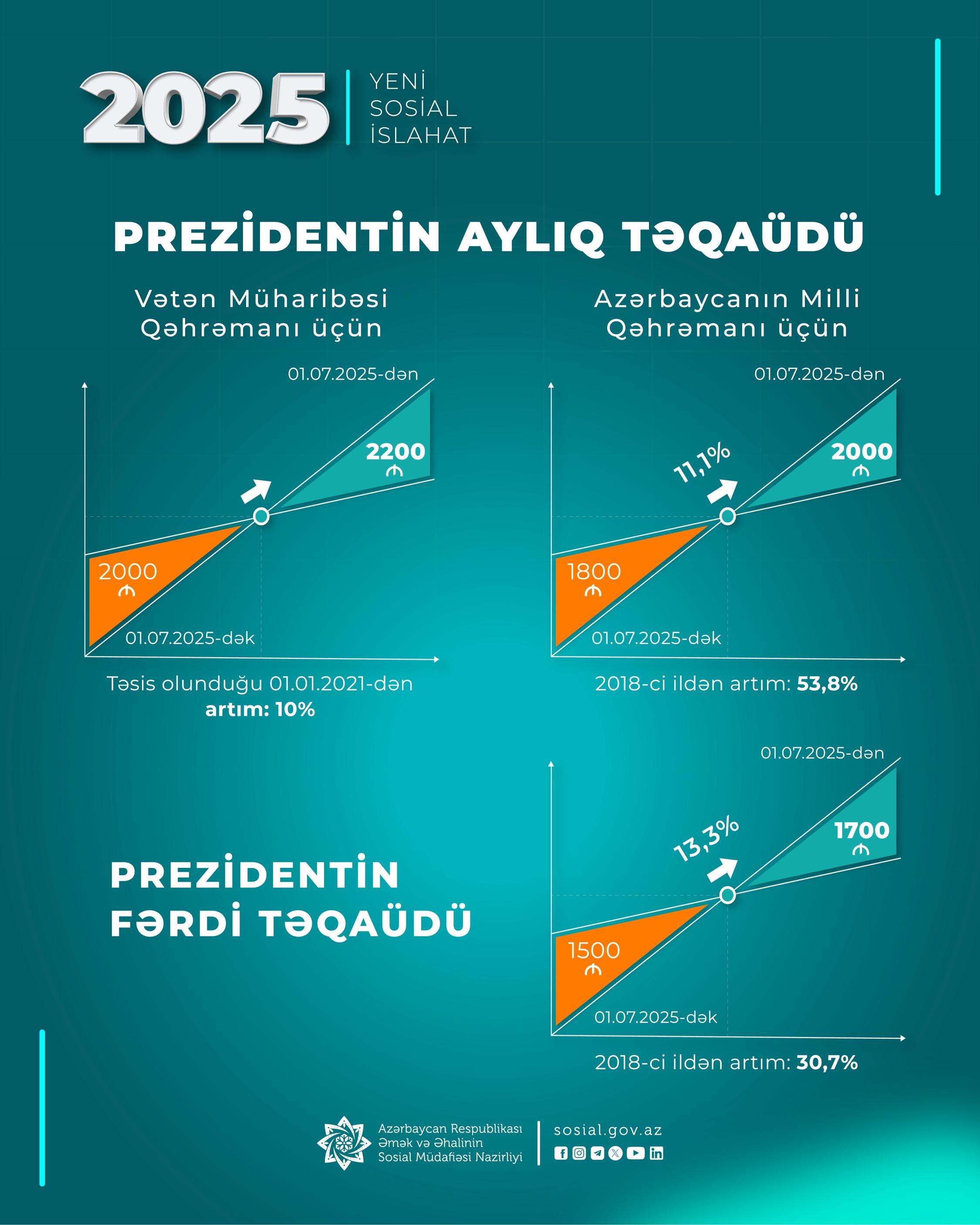 - Azərbaycan Respublikası Prezidentinin fərdi təqaüdü — 1700 manata çatdırılır;
